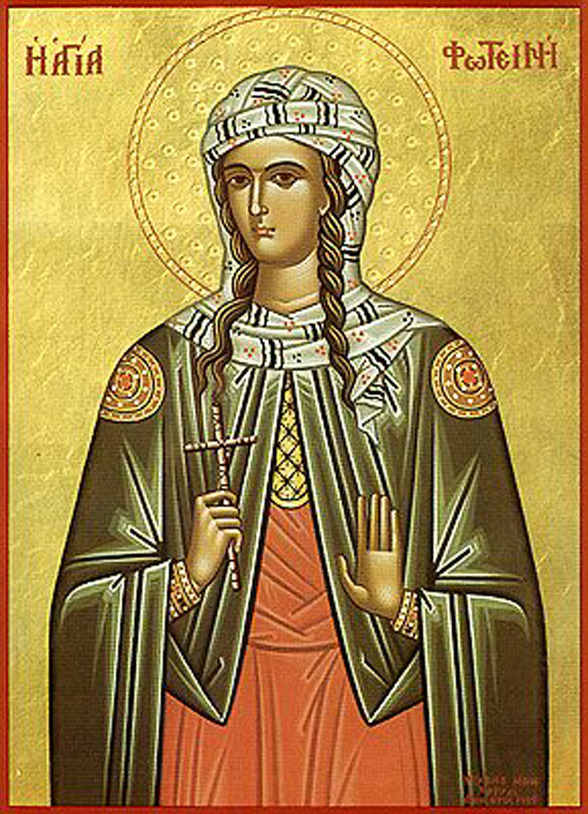 예수님의 제자가 된 포티나는 그리스도의 복음을 전하다가 3년 동안 감옥에 갇혔다가 카르타고(Carthago)에서 순교하였다. 또 다른 전설에 의하면 성녀의 아들인 요셉, 빅토르와 함께 모두 네로 황제 때 로마에서 순교했다고 한다. 전하는 바에 의하면 순교하기 전에 네로 황제의 딸 돔니나(Domnina)와 백여 명에 달하는 그녀의 노예들을 그리스도교로 개종시켰다고 한다. 성녀의 유해는 여러 해 동안 성 바오로 대성당에서 공경되었다.