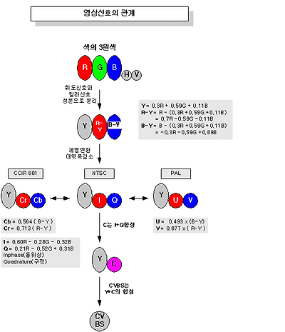 YCbCr인 경우는 영상 비율이 4:2:2 혹은 4:1:1이고, YIQ인 경우는 대역폭이 4.25MHz:1.5MHz:0.5MHz이다.