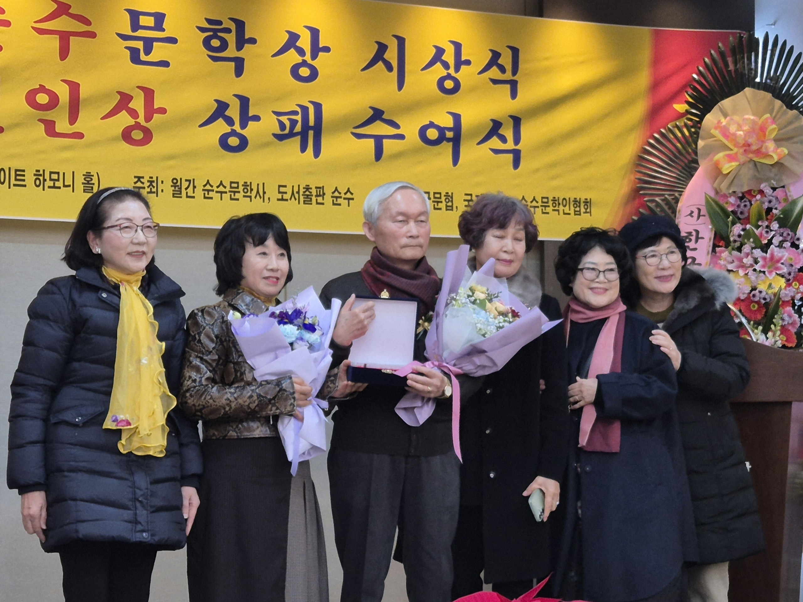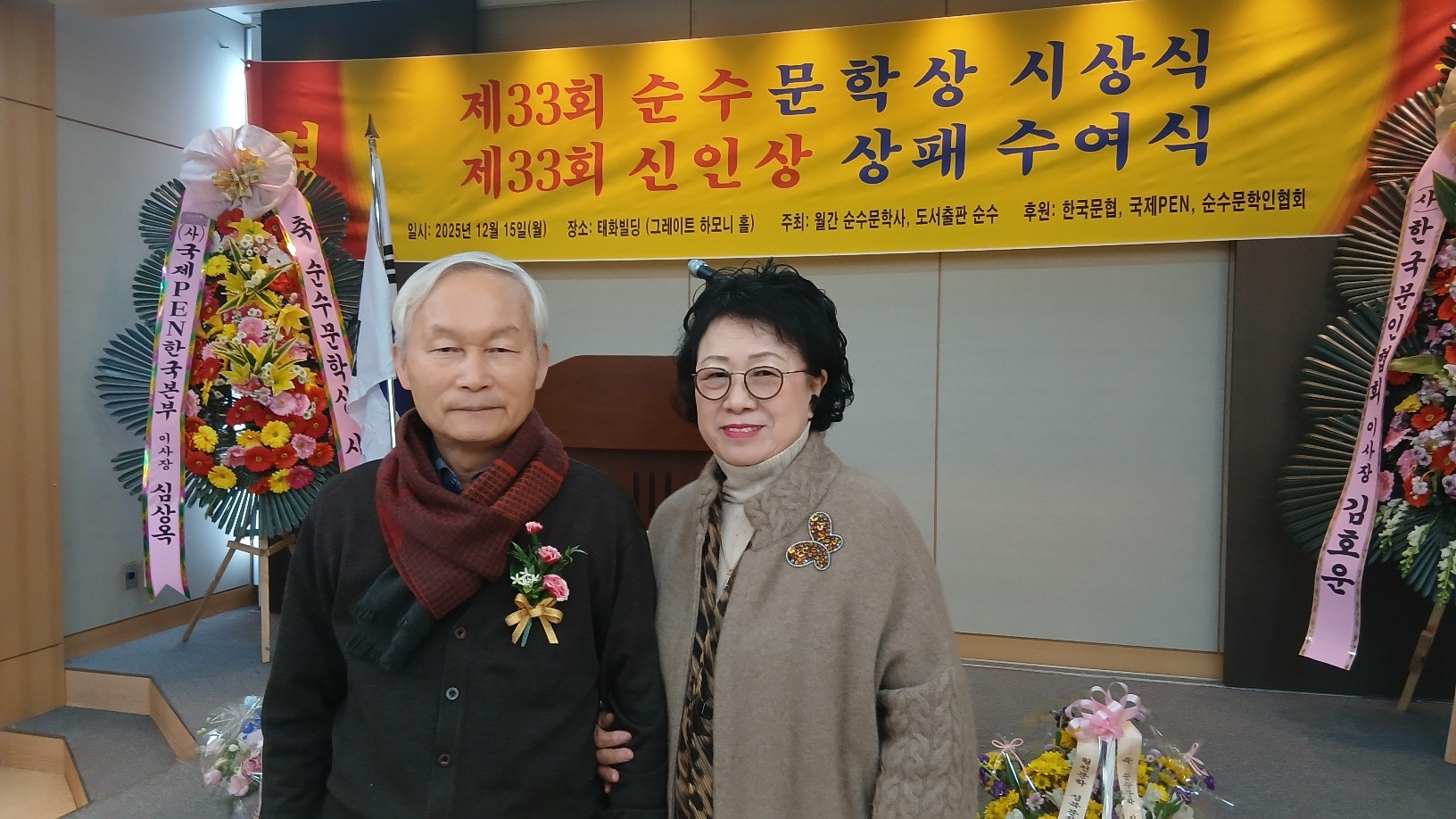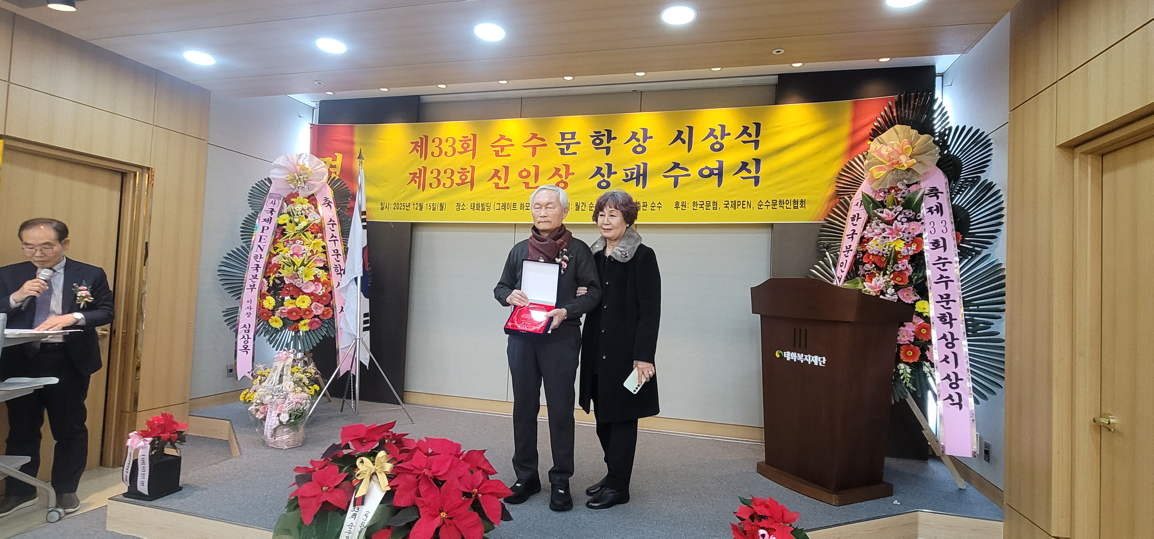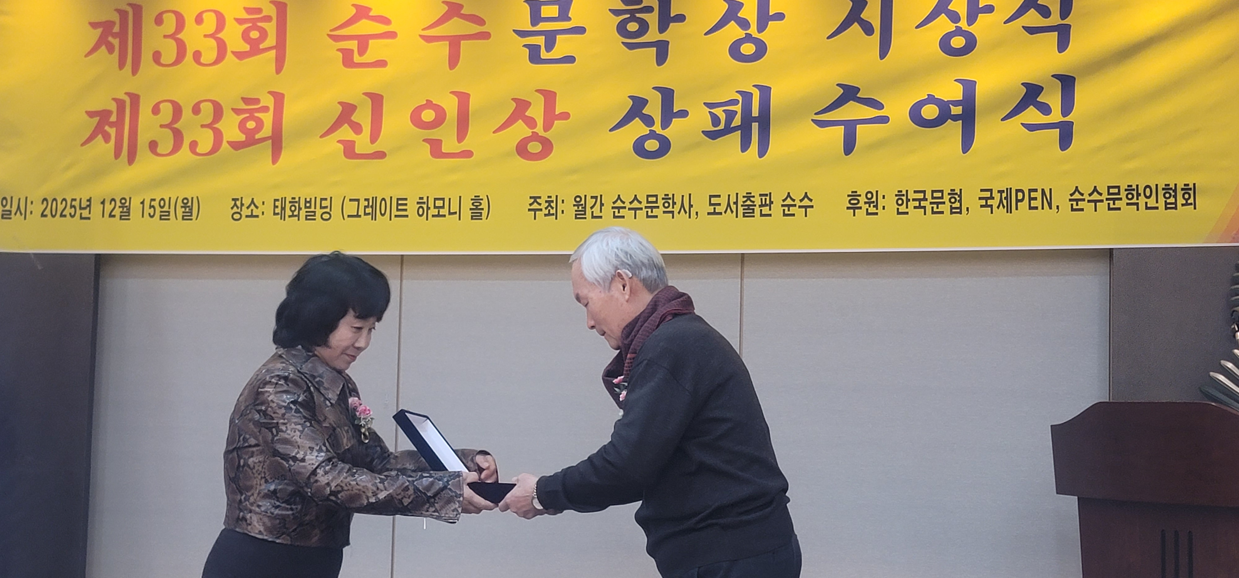 33년간 월간 문학지 ‘순수문학’을 발행하는 순수문학사(대표 박영하, 한국문인협회 시분과 회장)가 지난 12월 15일(월요일) 오후 3시 인사동 태화빌딩 그레이트 하모니홀에서, 매년 1번 수여하는 문학상에 류시호 작가가 권남희 한국수필가협회 이사장이 수여한 제33회 순수문학상 수필부문<본상>을 수상했다.