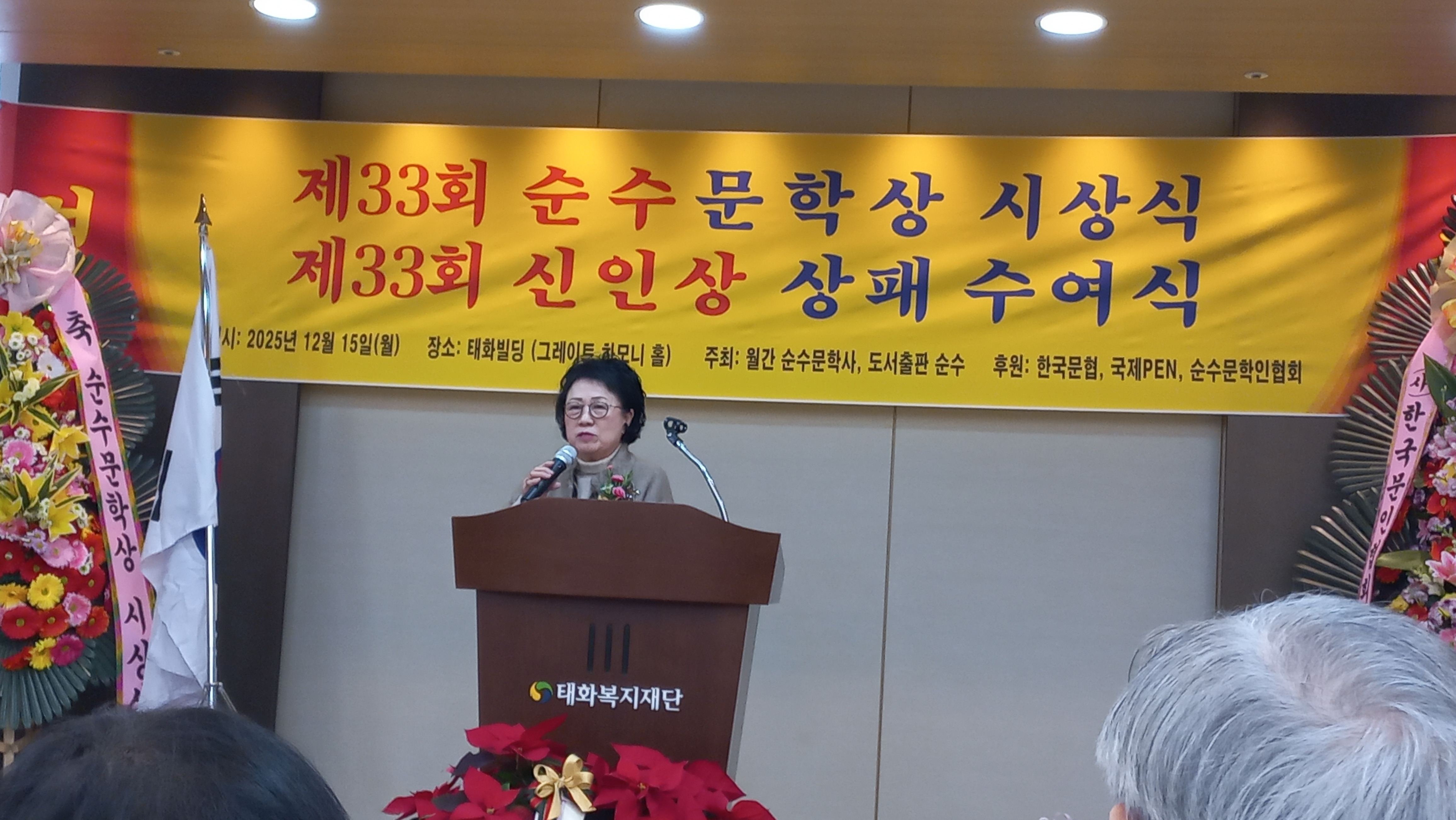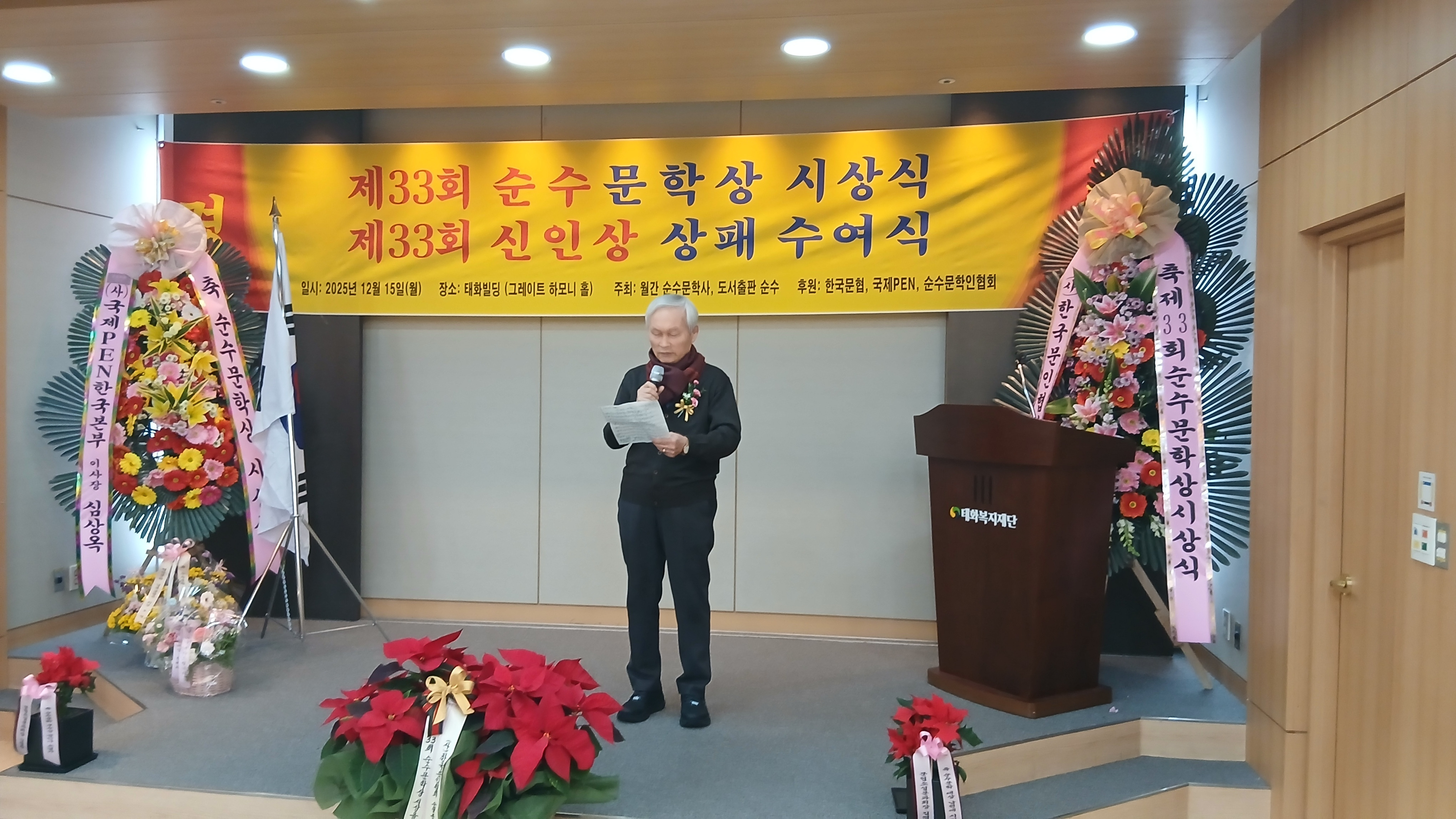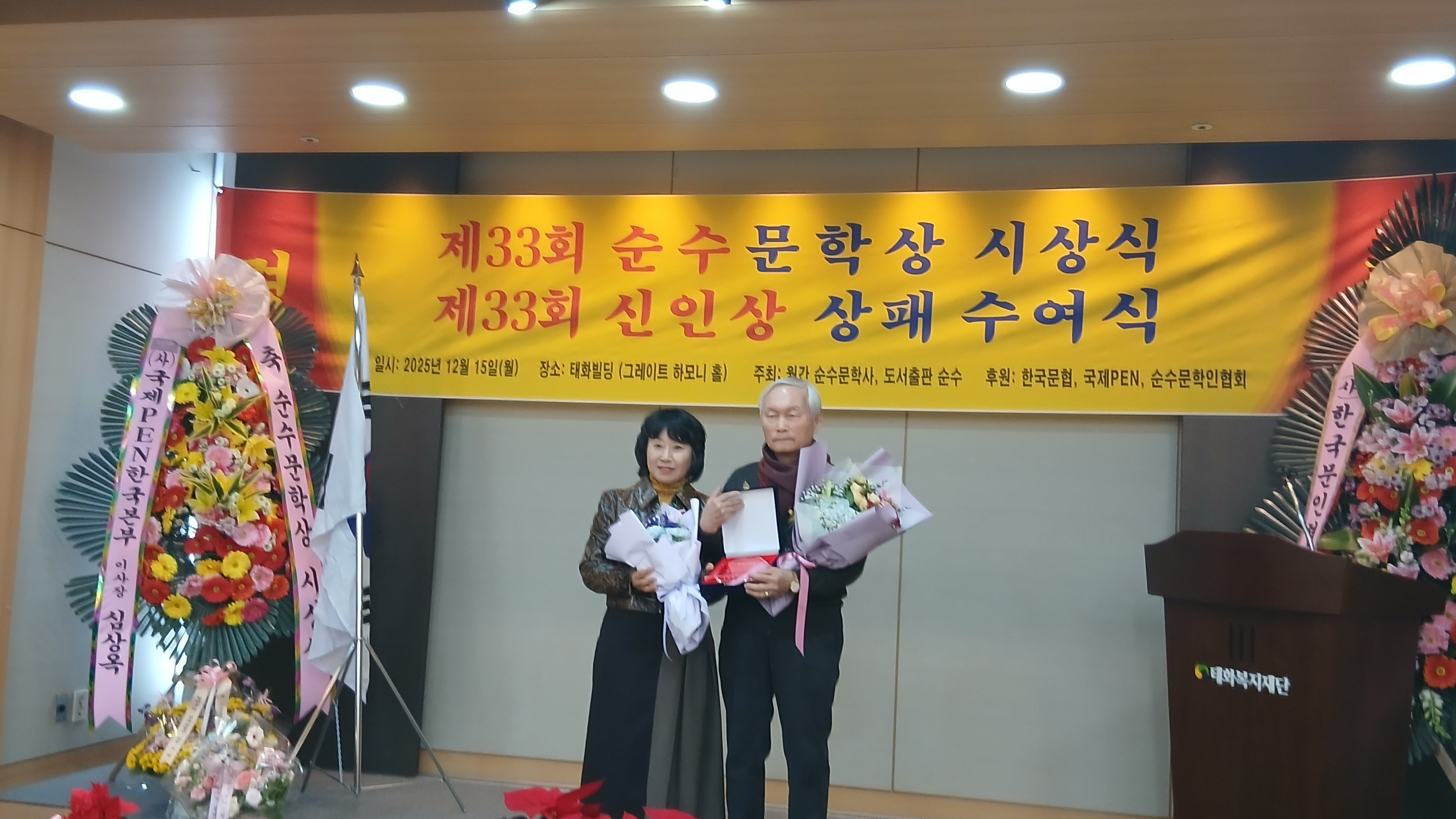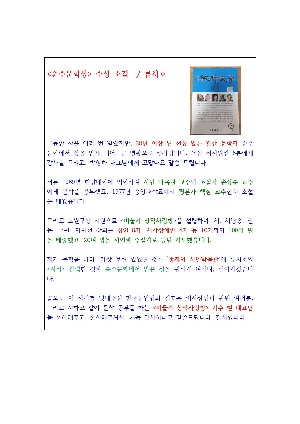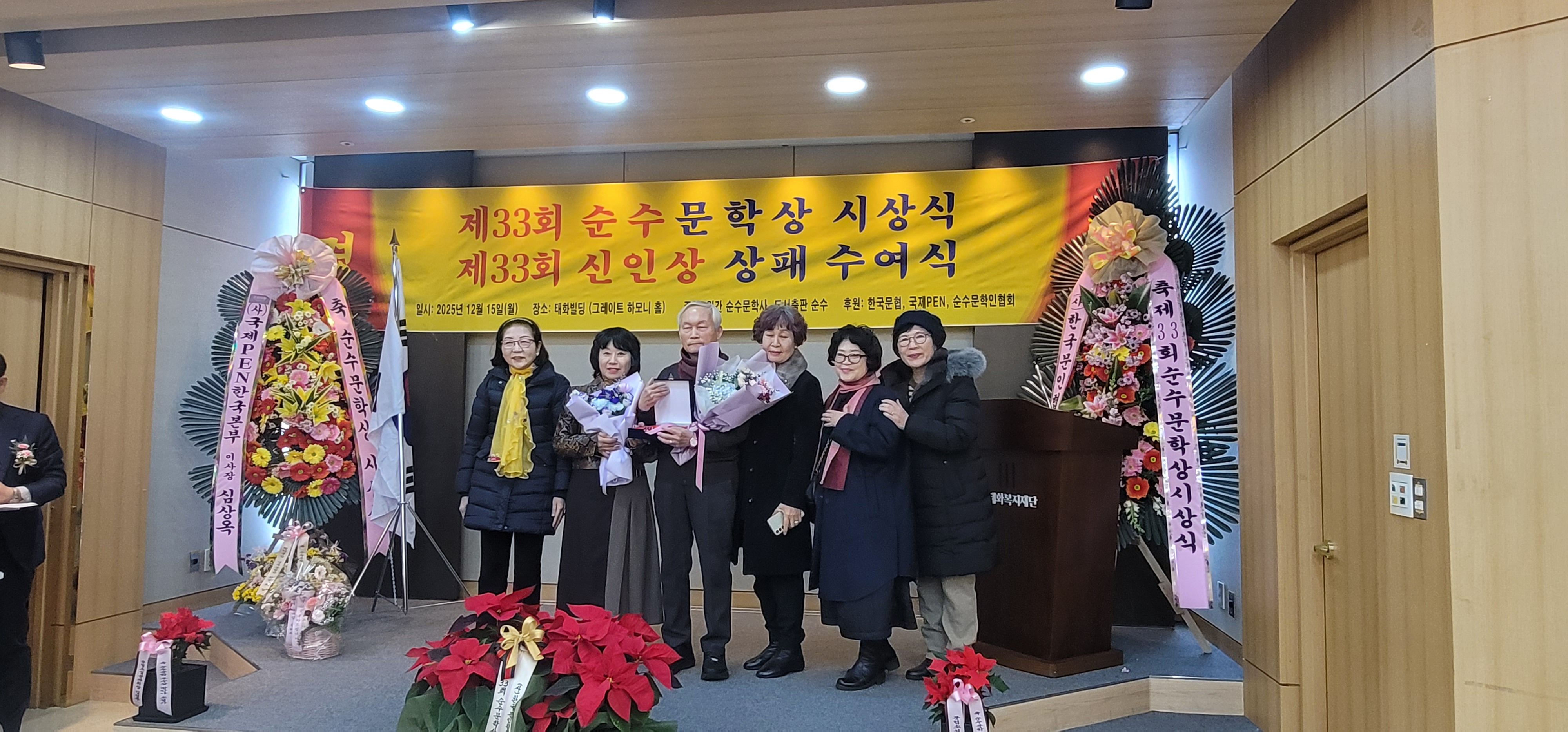 33년간 월간 문학지 ‘순수문학’을 발행하는 순수문학사(대표 박영하, 한국문인협회 시분과 회장)가 지난 12월 15일(월요일) 오후 3시 인사동 태화빌딩 그레이트 하모니홀에서, 매년 1번 수여하는 문학상에 류시호 작가가 권남희 한국수필가협회 이사장이 수여한 제33회 순수문학상 수필부문<본상>을 수상했다.