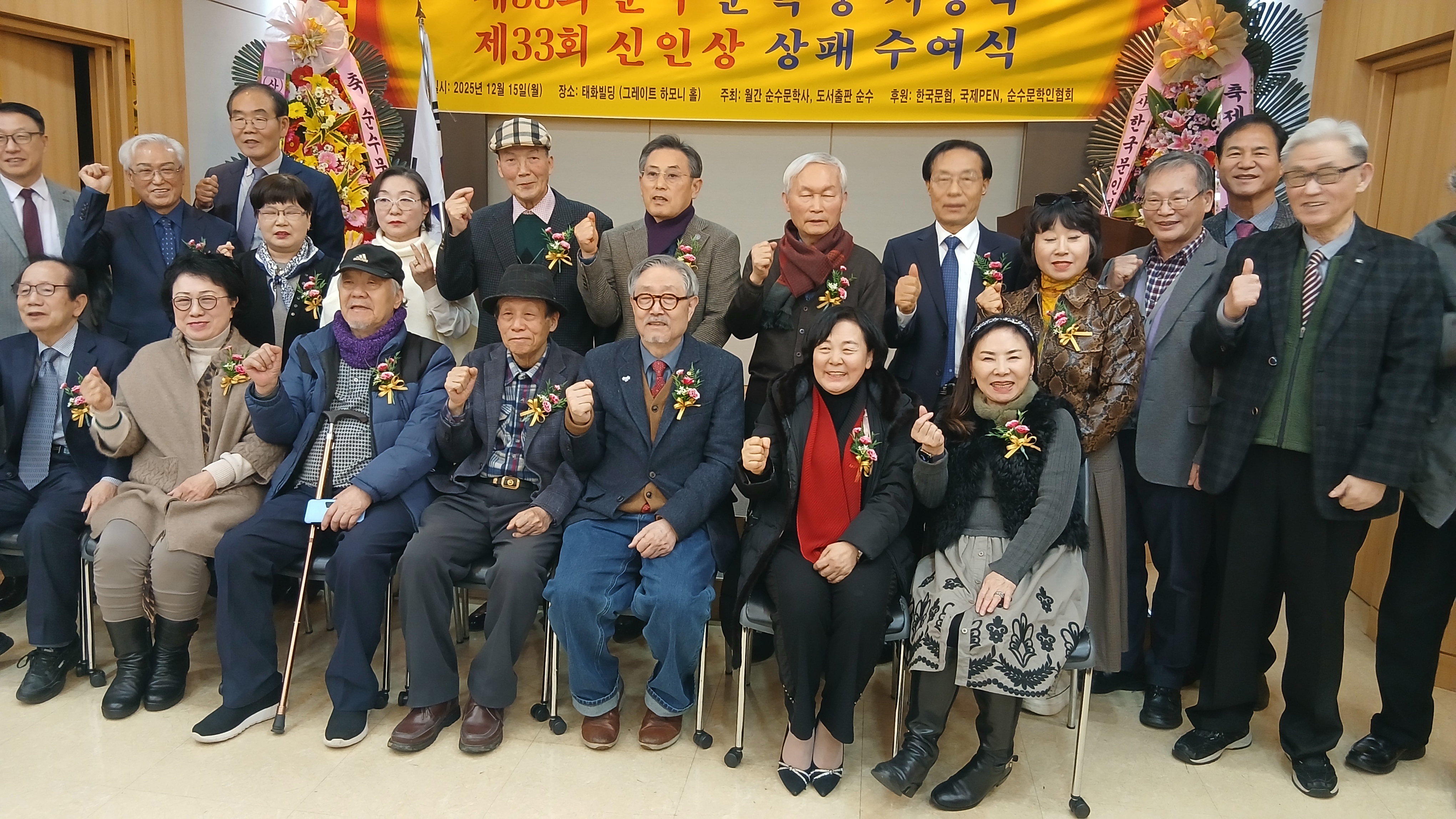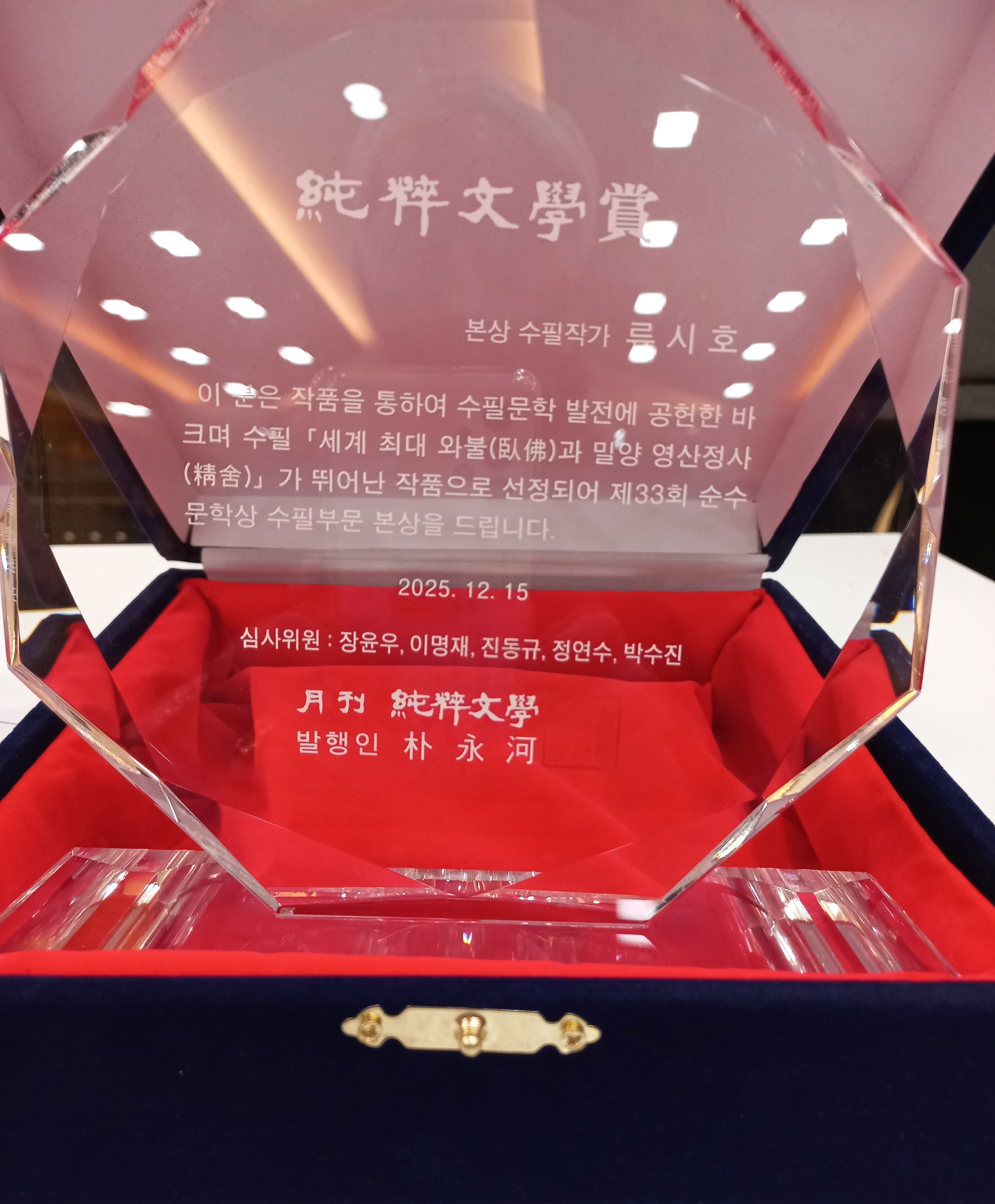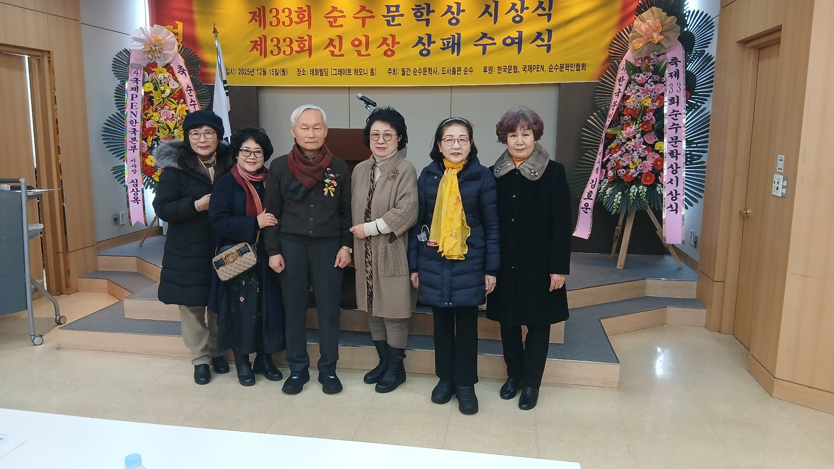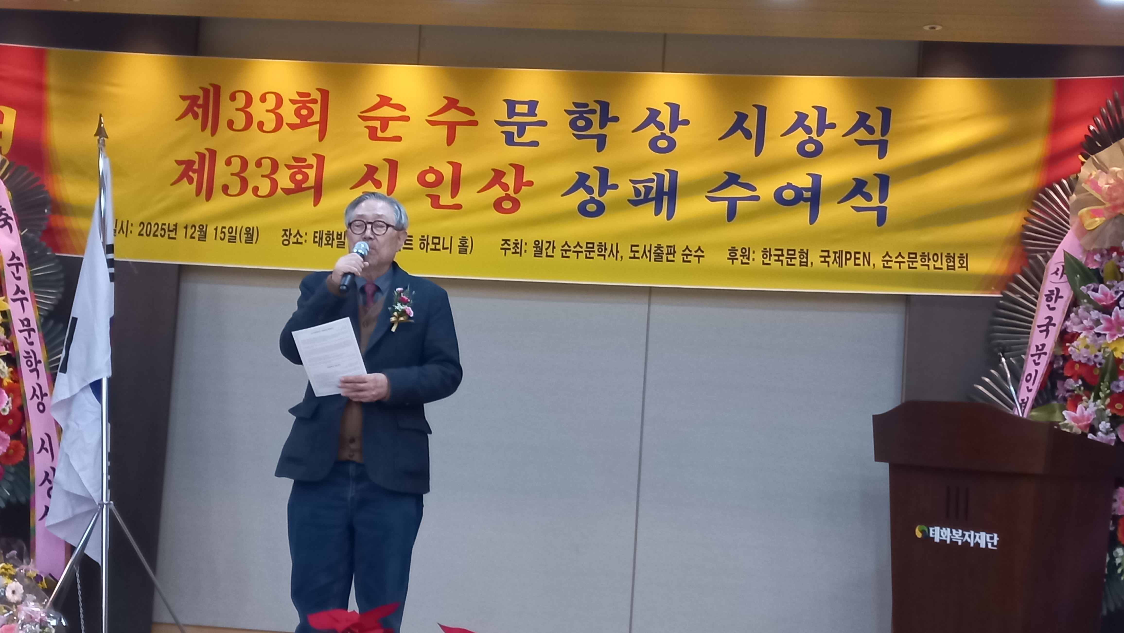 33년간 월간 문학지 ‘순수문학’을 발행하는 순수문학사(대표 박영하, 한국문인협회 시분과 회장)가 지난 12월 15일(월요일) 오후 3시 인사동 태화빌딩 그레이트 하모니홀에서, 매년 1번 수여하는 문학상에 류시호 작가가 권남희 한국수필가협회 이사장이 수여한 제33회 순수문학상 수필부문<본상>을 수상했다.
