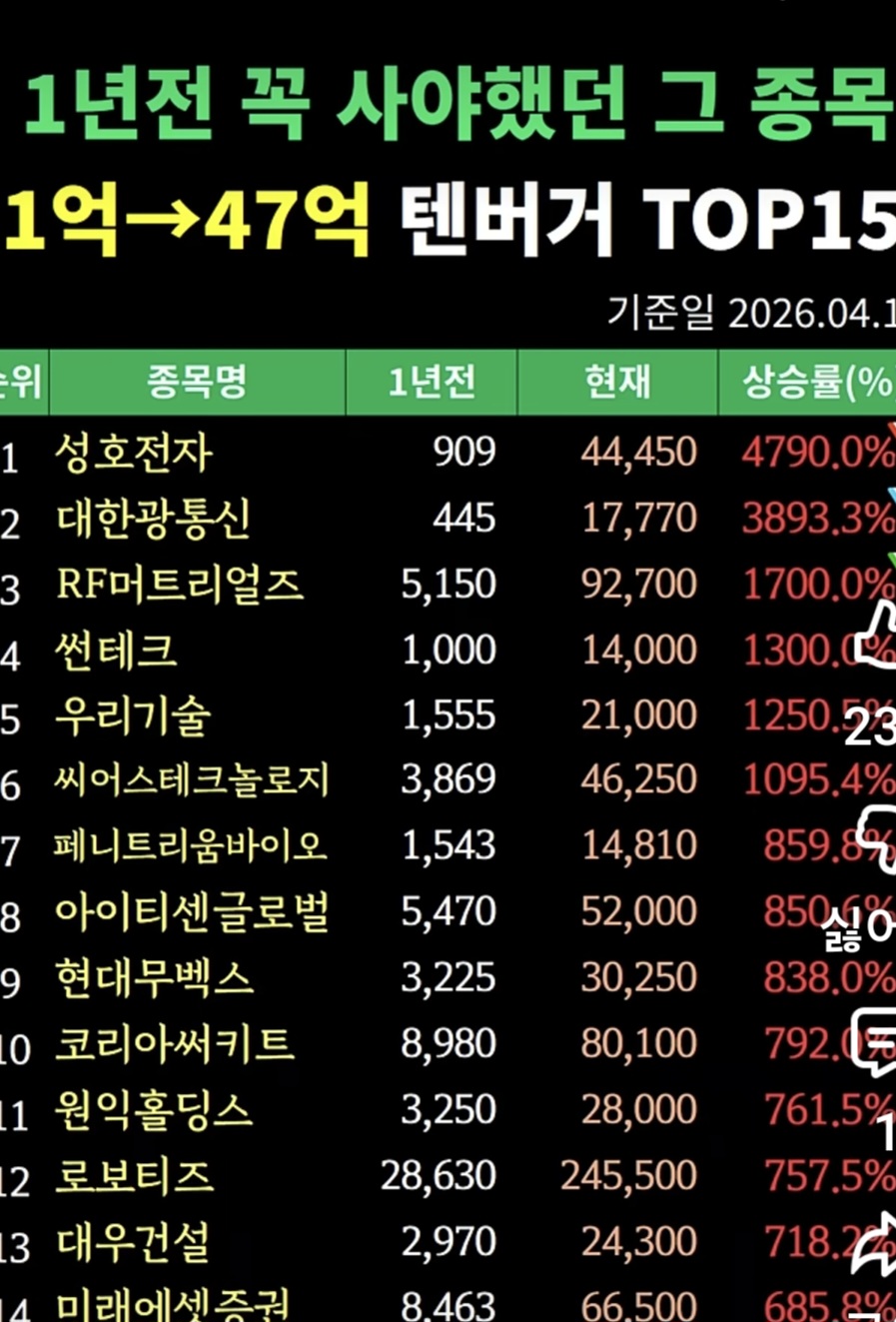작성자윤선생 작성시간 26.04.13 주식투자에서 중요 한것은 장기투자가 아니고 종목선정 인가 봅니다.