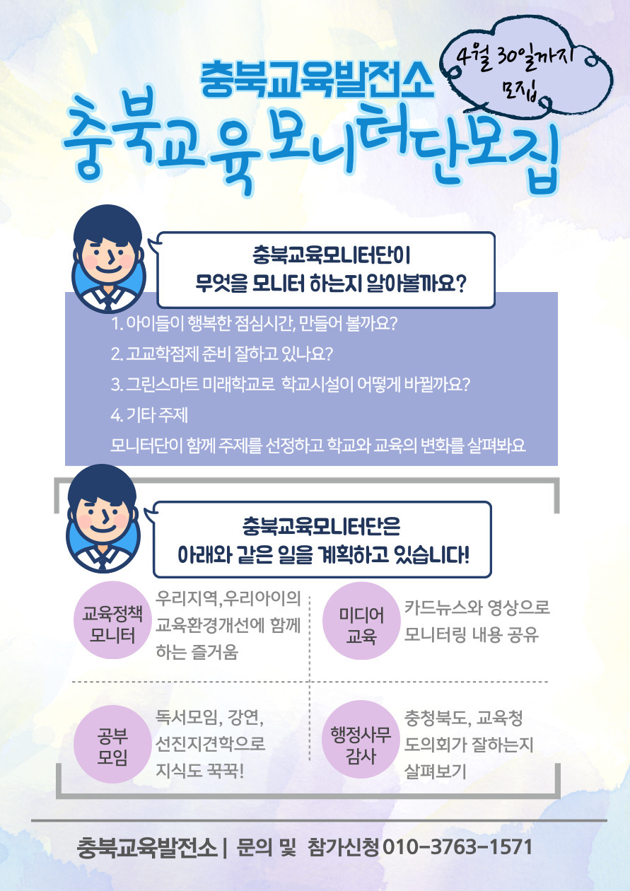 교육정책모니터, 행정사무감사참관, 스터디 및 미디어활동으로 충북교육발전에 함께하실 모니터단을 모십니다.^^