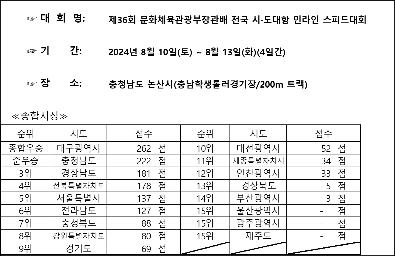 제36회 문화체육관광부장관배 전국 시도대항 인라인 스피드대회 결과표 안내하여 드립니다.