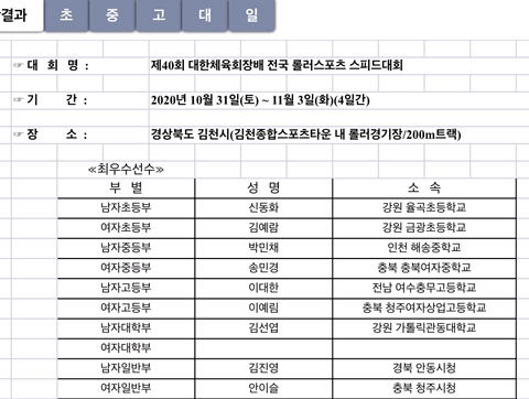 제40회 대한체육회장배 전국 롤러스포츠 스피드대회 결과표를 안내하여 드립니다.