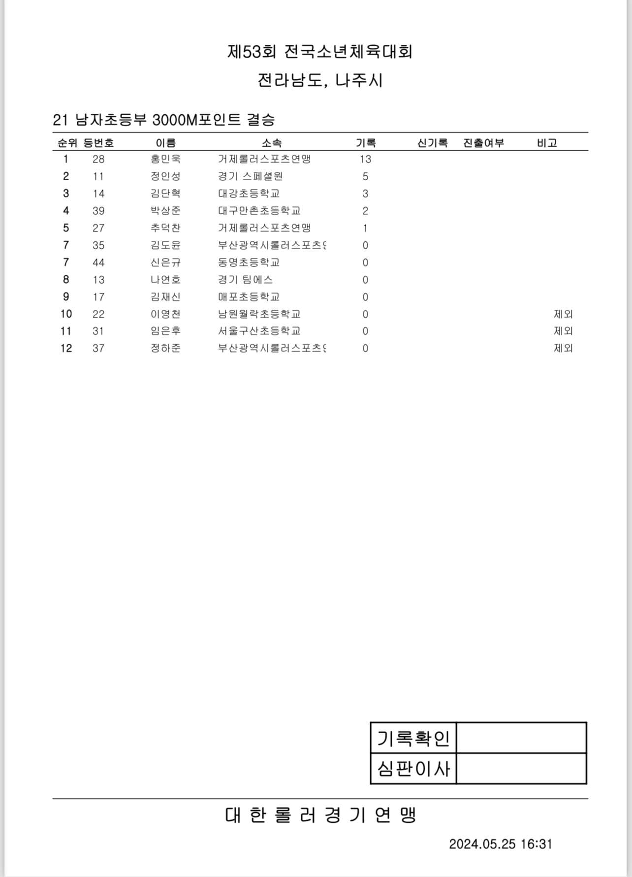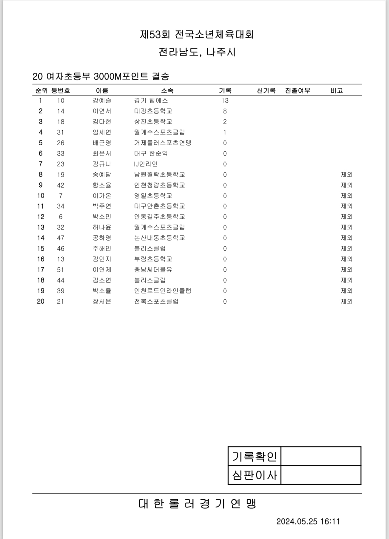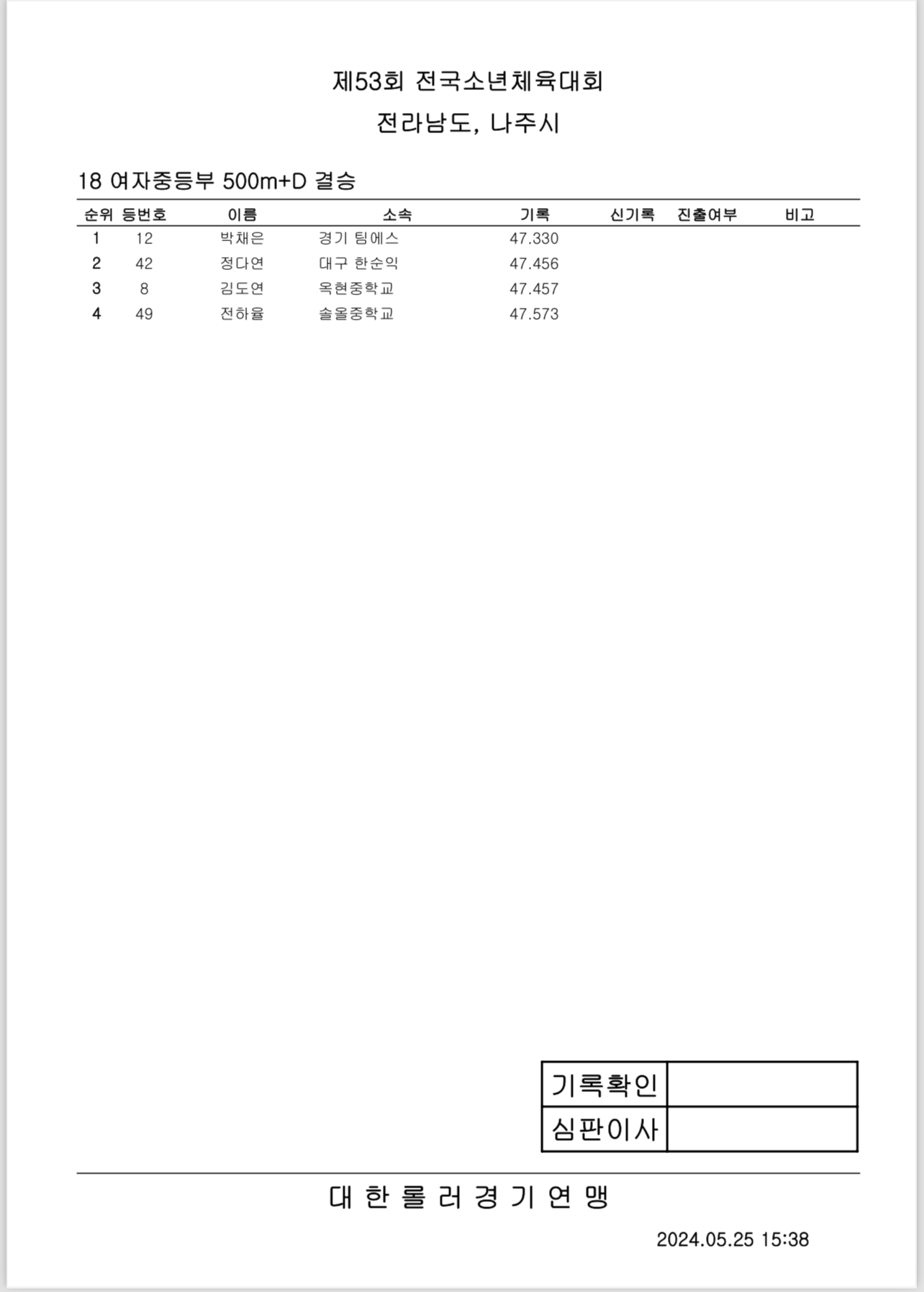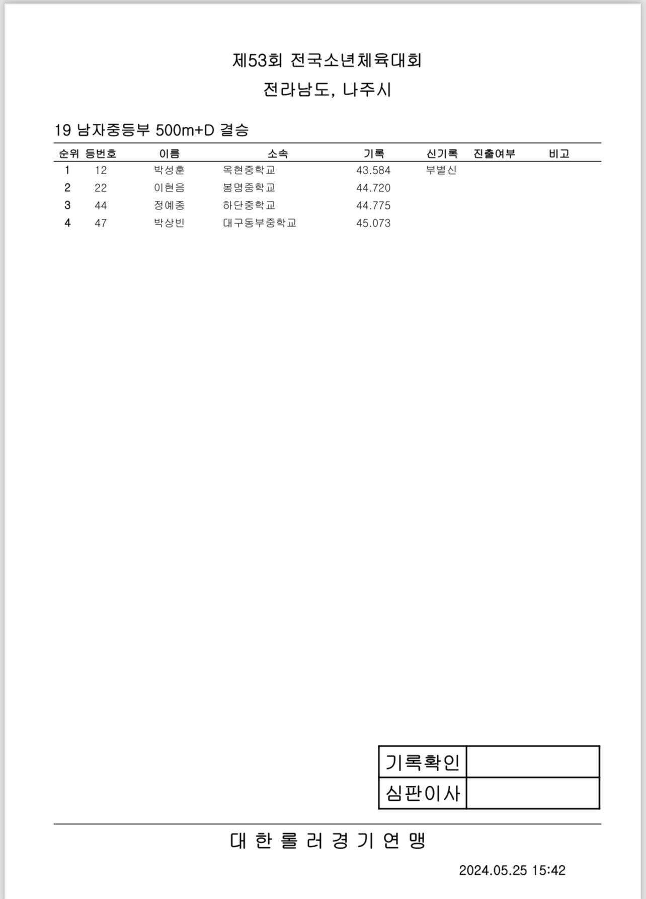 제53회 전국소년체전 1일차 경기 결과 작성자아바타|작성시간24.05.25|조회수437 목록 댓글 0 글자크기 작게가 글자크기 크게가 제53회 전국소년체전 1일차 경기 결과출처: 대한롤러스포츠연맹16_여자초등부_결승_500m+D.pdf30.27KB19_남자중등부_결승_500m+D.pdf30.89KB14_여자중등부_결승_E10000M.pdf42.43KB17_남자초등부_결승_500m+D.pdf31.48KB20_여자초등부_결승_3000M포인트.pdf43.95KB15_남자중등부_결승_E10000M.pdf48.70KB18_여자중등부_결승_500m+D.pdf30.76KB21_남자초등부_결승_3000M포인트.pdf38.21KB 첨부파일첨부된 파일이 16개 있습니다. etc 파일 IMG_2896.PNG 다운로드 etc 파일 IMG_2897.PNG 다운로드 etc 파일 IMG_2898.PNG 다운로드 etc 파일 IMG_2899.PNG 다운로드 etc 파일 IMG_2901.PNG 다운로드 etc 파일 IMG_2902.PNG 다운로드 etc 파일 IMG_2903.PNG 다운로드 etc 파일 IMG_2904.PNG 다운로드 pdf 파일 16_여자초등부_결승_500m D.pdf 다운로드 pdf 파일 19_남자중등부_결승_500m D.pdf 다운로드 pdf 파일 14_여자중등부_결승_E10000M.pdf 다운로드 pdf 파일 17_남자초등부_결승_500m D.pdf 다운로드 pdf 파일 20_여자초등부_결승_3000M포인트.pdf 다운로드 pdf 파일 15_남자중등부_결승_E10000M.pdf 다운로드 pdf 파일 18_여자중등부_결승_500m D.pdf 다운로드 pdf 파일 21_남자초등부_결승_3000M포인트.pdf 다운로드 다음검색 현재 게시글 추가 기능 열기 북마크 공유하기 신고 센터로 신고 댓글 댓글 0 댓글쓰기 답글쓰기 댓글 리스트
