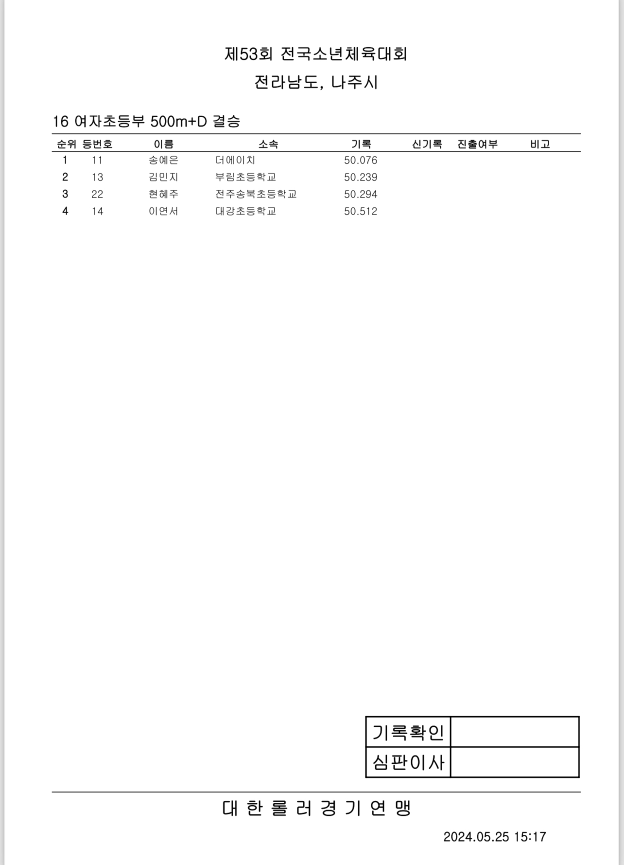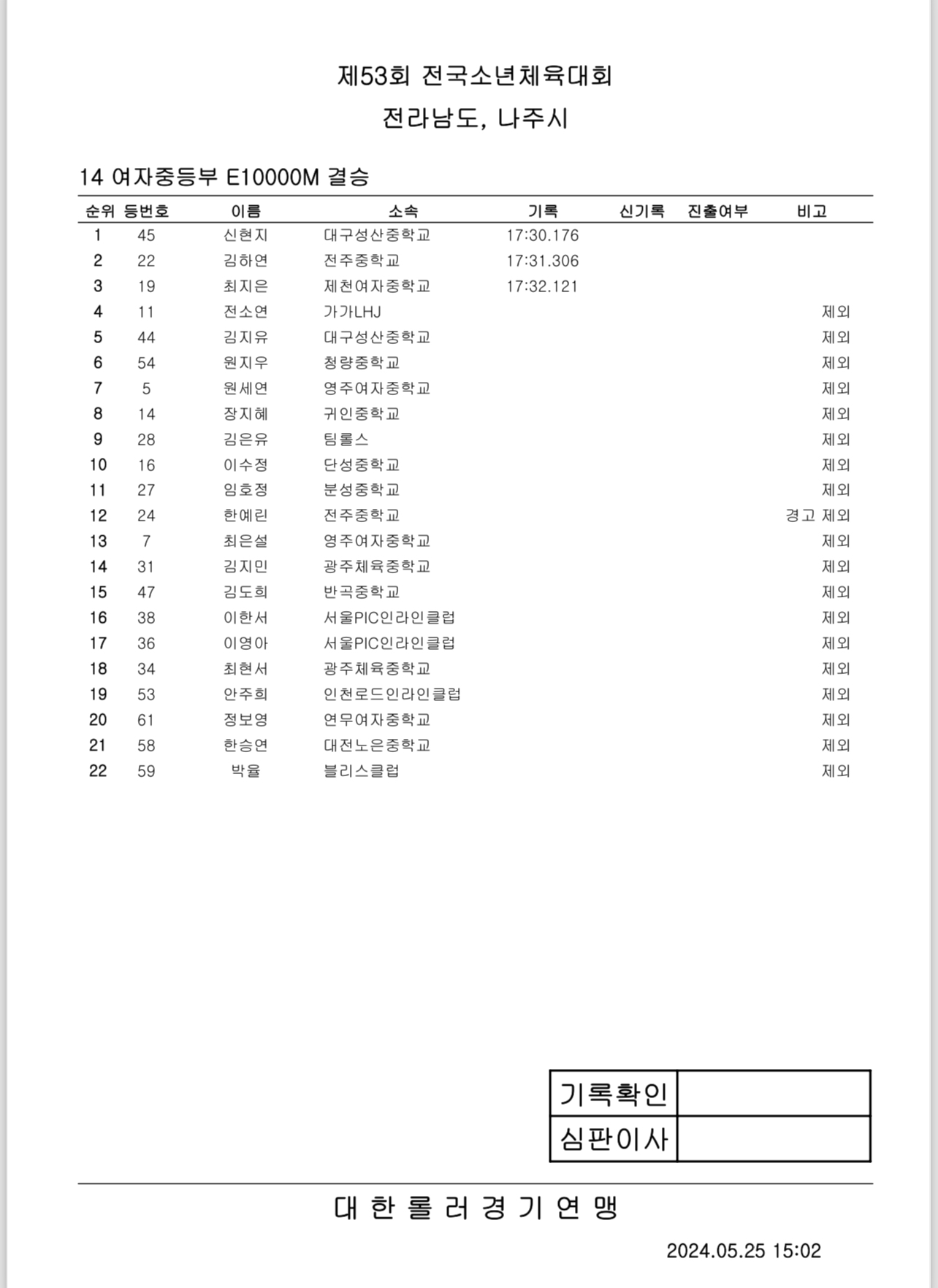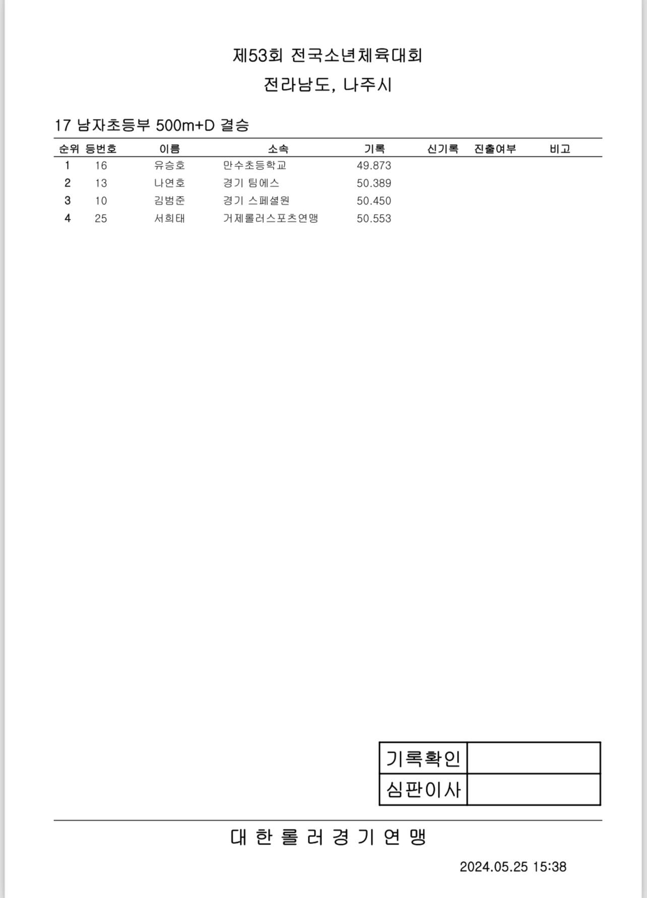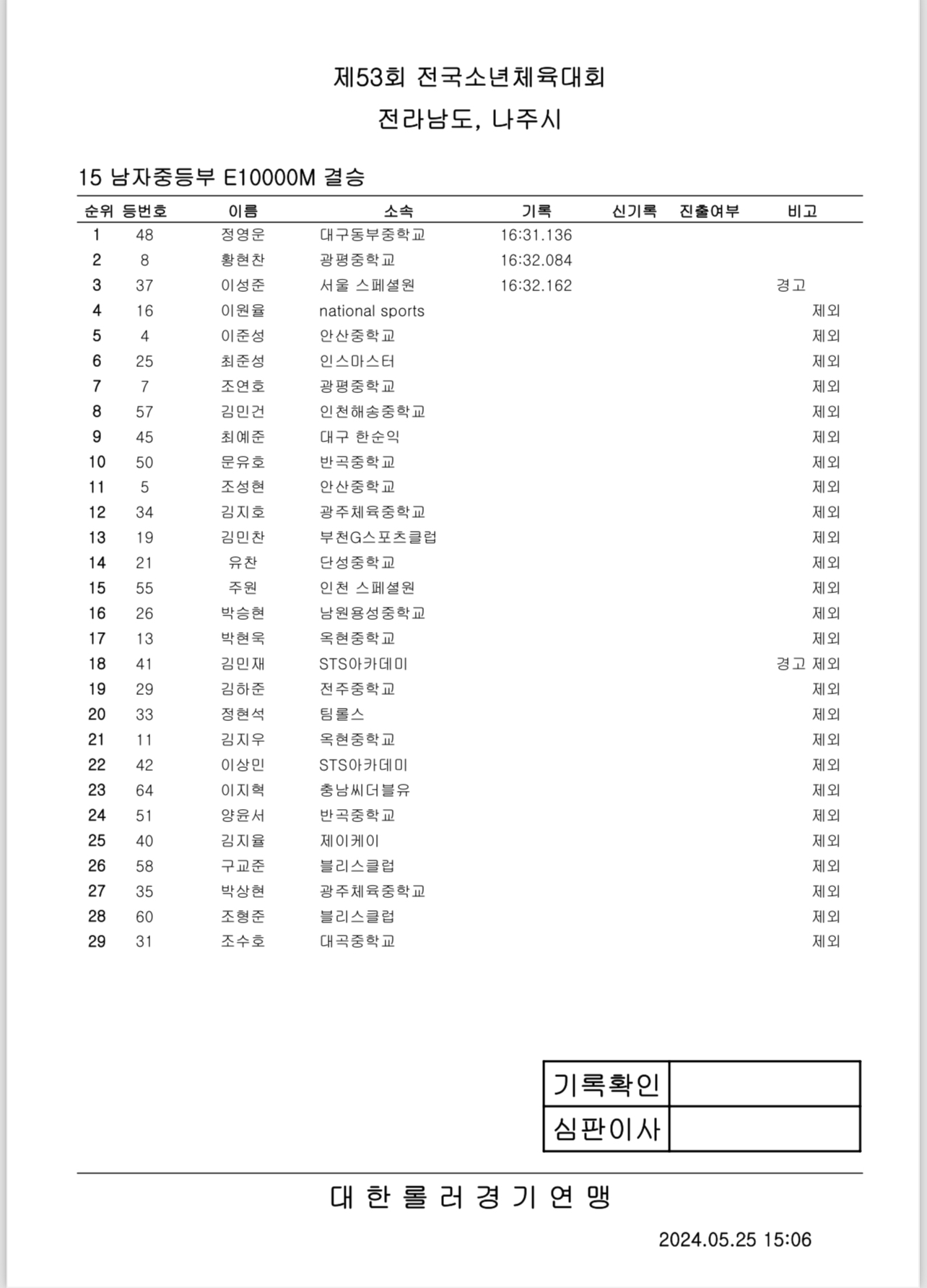 제53회 전국소년체전 1일차 경기 결과 작성자아바타|작성시간24.05.25|조회수437 목록 댓글 0 글자크기 작게가 글자크기 크게가 제53회 전국소년체전 1일차 경기 결과출처: 대한롤러스포츠연맹16_여자초등부_결승_500m+D.pdf30.27KB19_남자중등부_결승_500m+D.pdf30.89KB14_여자중등부_결승_E10000M.pdf42.43KB17_남자초등부_결승_500m+D.pdf31.48KB20_여자초등부_결승_3000M포인트.pdf43.95KB15_남자중등부_결승_E10000M.pdf48.70KB18_여자중등부_결승_500m+D.pdf30.76KB21_남자초등부_결승_3000M포인트.pdf38.21KB 첨부파일첨부된 파일이 16개 있습니다. etc 파일 IMG_2896.PNG 다운로드 etc 파일 IMG_2897.PNG 다운로드 etc 파일 IMG_2898.PNG 다운로드 etc 파일 IMG_2899.PNG 다운로드 etc 파일 IMG_2901.PNG 다운로드 etc 파일 IMG_2902.PNG 다운로드 etc 파일 IMG_2903.PNG 다운로드 etc 파일 IMG_2904.PNG 다운로드 pdf 파일 16_여자초등부_결승_500m D.pdf 다운로드 pdf 파일 19_남자중등부_결승_500m D.pdf 다운로드 pdf 파일 14_여자중등부_결승_E10000M.pdf 다운로드 pdf 파일 17_남자초등부_결승_500m D.pdf 다운로드 pdf 파일 20_여자초등부_결승_3000M포인트.pdf 다운로드 pdf 파일 15_남자중등부_결승_E10000M.pdf 다운로드 pdf 파일 18_여자중등부_결승_500m D.pdf 다운로드 pdf 파일 21_남자초등부_결승_3000M포인트.pdf 다운로드 다음검색 현재 게시글 추가 기능 열기 북마크 공유하기 신고 센터로 신고 댓글 댓글 0 댓글쓰기 답글쓰기 댓글 리스트