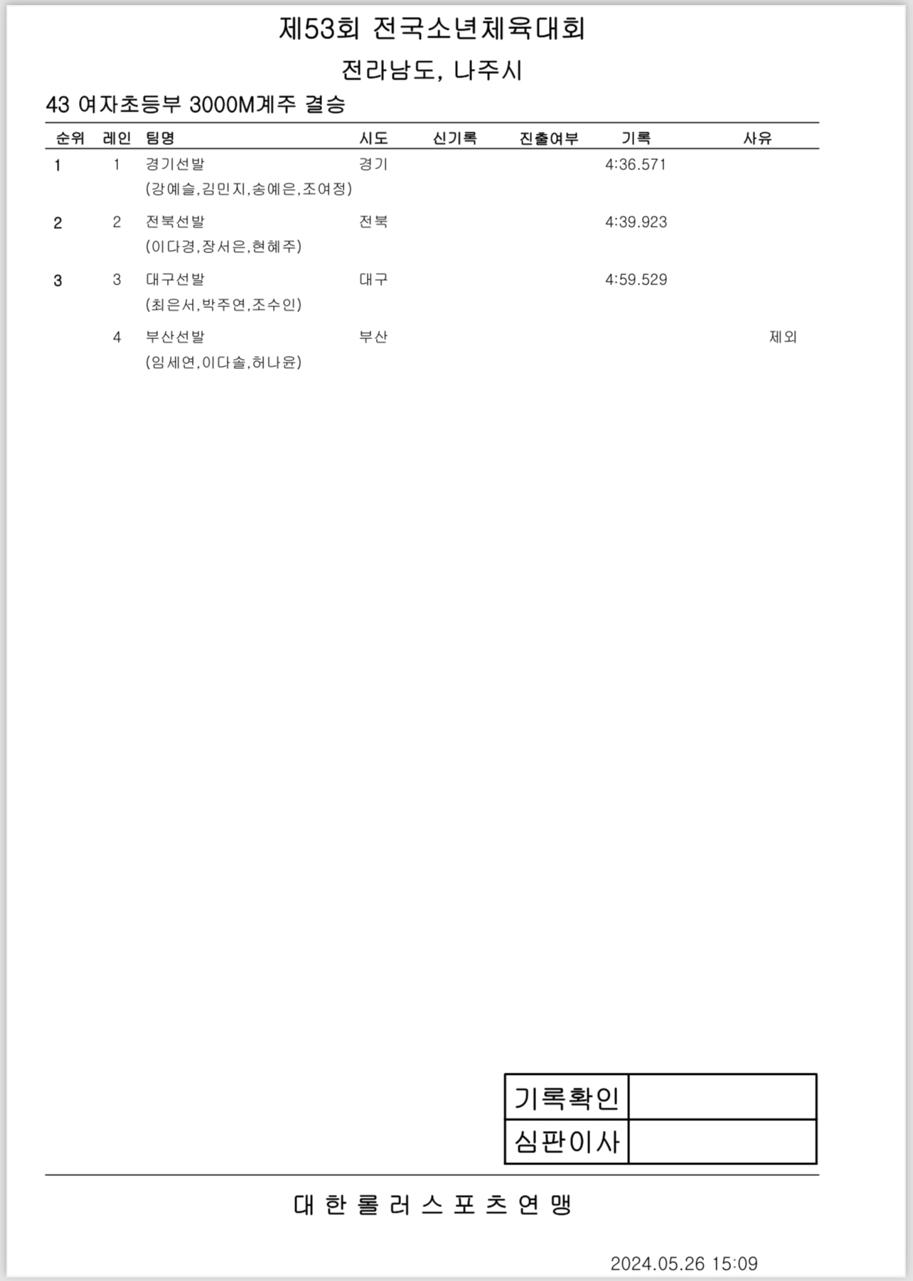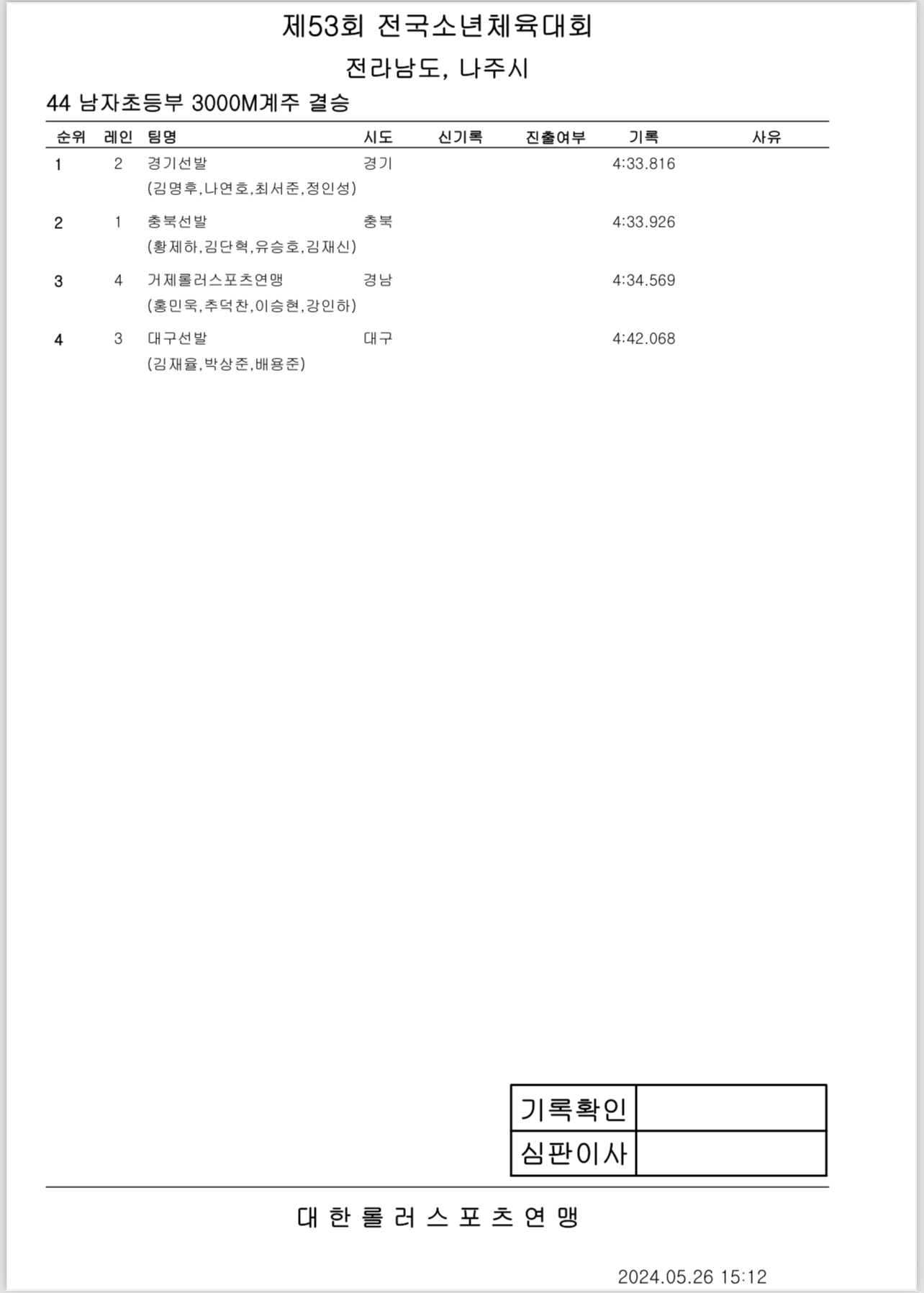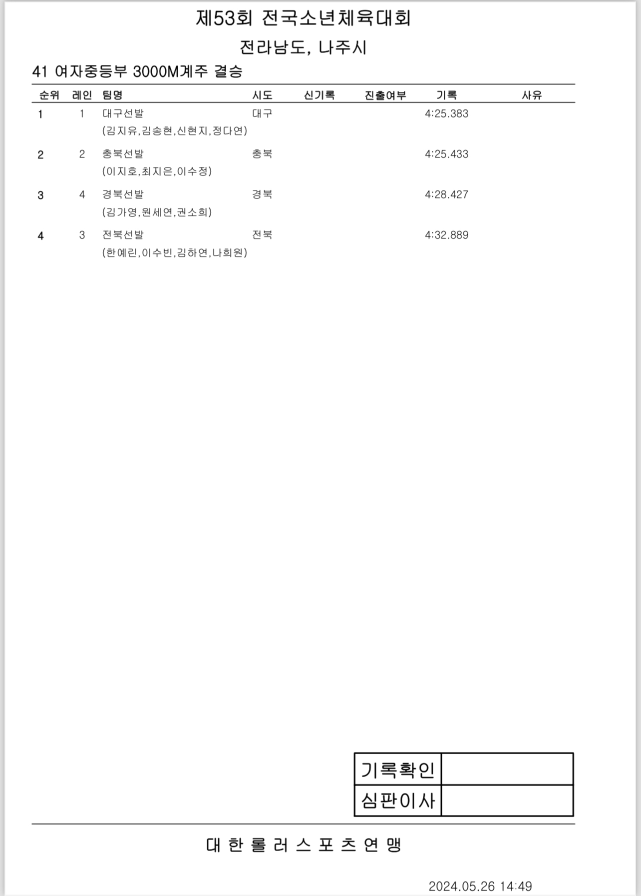 제53회 전국소년체전 2일차 경기 결과 작성자아바타|작성시간24.05.26|조회수290 목록 댓글 0 글자크기 작게가 글자크기 크게가 제53회 전국소년체전 2일차 경기 결과출처: 대한롤러스포츠연맹43_여자초등부_결승_3000M계주.pdf33.36KB40_남자초등부_결승_1000M.pdf37.14KB42_남자중등부_결승_3000M계주.pdf34.44KB39_여자초등부_결승_1000M.pdf35.35KB44_남자초등부_결승_3000M계주.pdf34.27KB38_남자중등부_결승_1000M.pdf34.90KB37_여자중등부_결승_1000M.pdf34.87KB41_여자중등부_결승_3000M계주.pdf33.04KB 첨부파일첨부된 파일이 16개 있습니다. etc 파일 IMG_2907.PNG 다운로드 etc 파일 IMG_2908.PNG 다운로드 etc 파일 IMG_2909.PNG 다운로드 etc 파일 IMG_2910.PNG 다운로드 etc 파일 IMG_2911.PNG 다운로드 etc 파일 IMG_2912.PNG 다운로드 etc 파일 IMG_2913.PNG 다운로드 etc 파일 IMG_2914.PNG 다운로드 pdf 파일 43_여자초등부_결승_3000M계주.pdf 다운로드 pdf 파일 40_남자초등부_결승_1000M.pdf 다운로드 pdf 파일 42_남자중등부_결승_3000M계주.pdf 다운로드 pdf 파일 39_여자초등부_결승_1000M.pdf 다운로드 pdf 파일 44_남자초등부_결승_3000M계주.pdf 다운로드 pdf 파일 38_남자중등부_결승_1000M.pdf 다운로드 pdf 파일 37_여자중등부_결승_1000M.pdf 다운로드 pdf 파일 41_여자중등부_결승_3000M계주.pdf 다운로드 다음검색 현재 게시글 추가 기능 열기 북마크 공유하기 신고 센터로 신고 댓글 댓글 0 댓글쓰기 답글쓰기 댓글 리스트