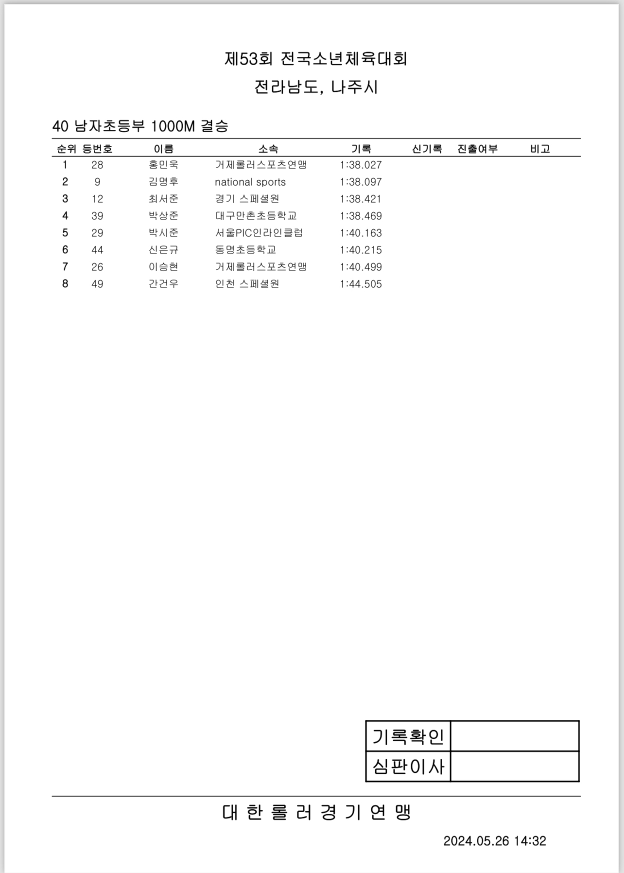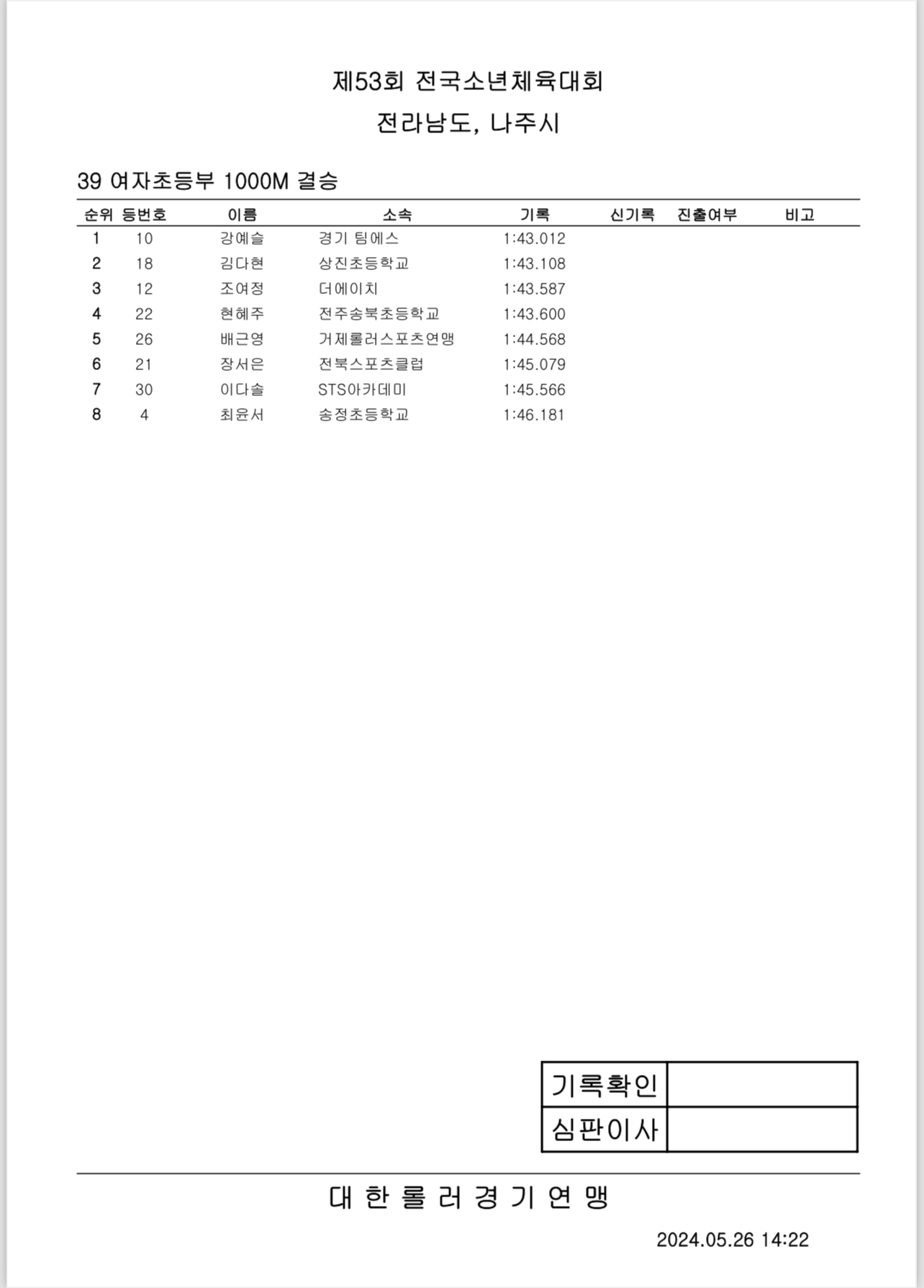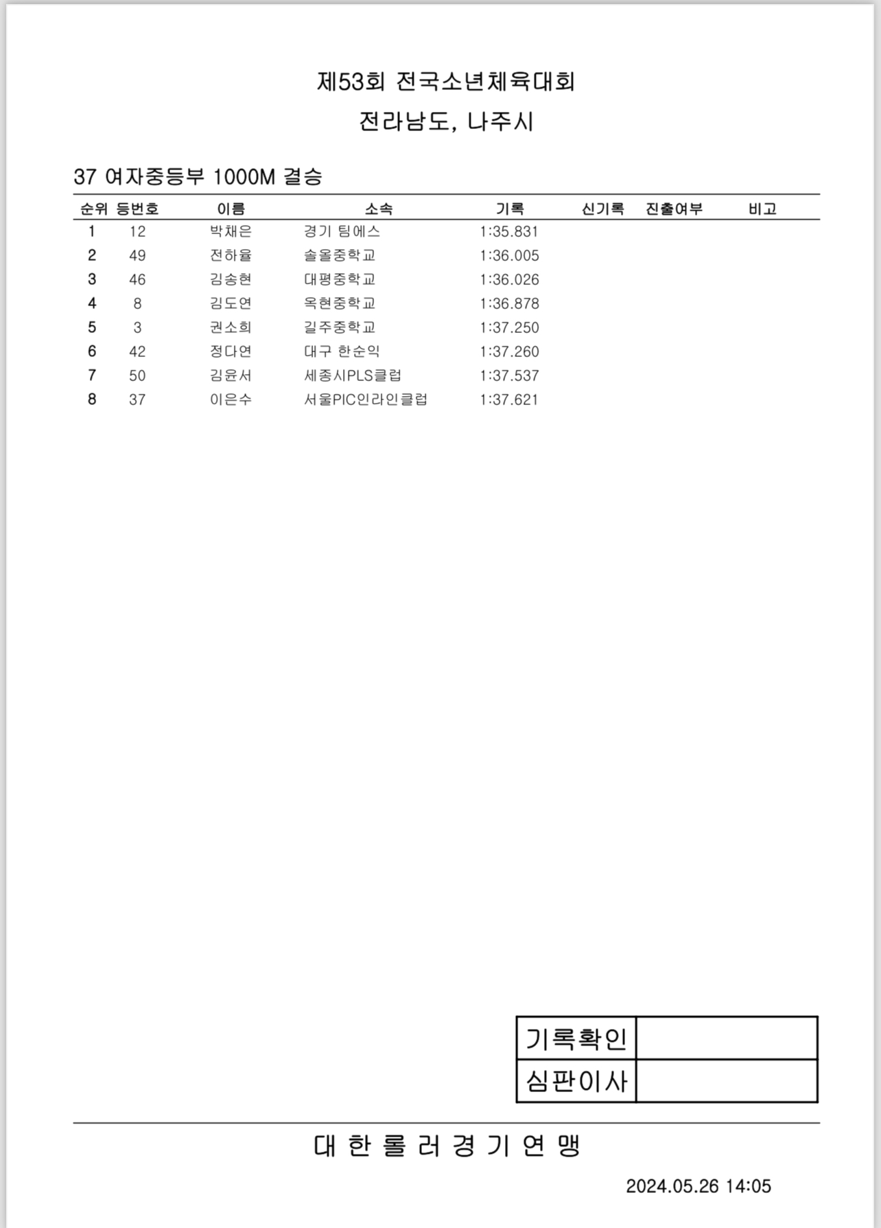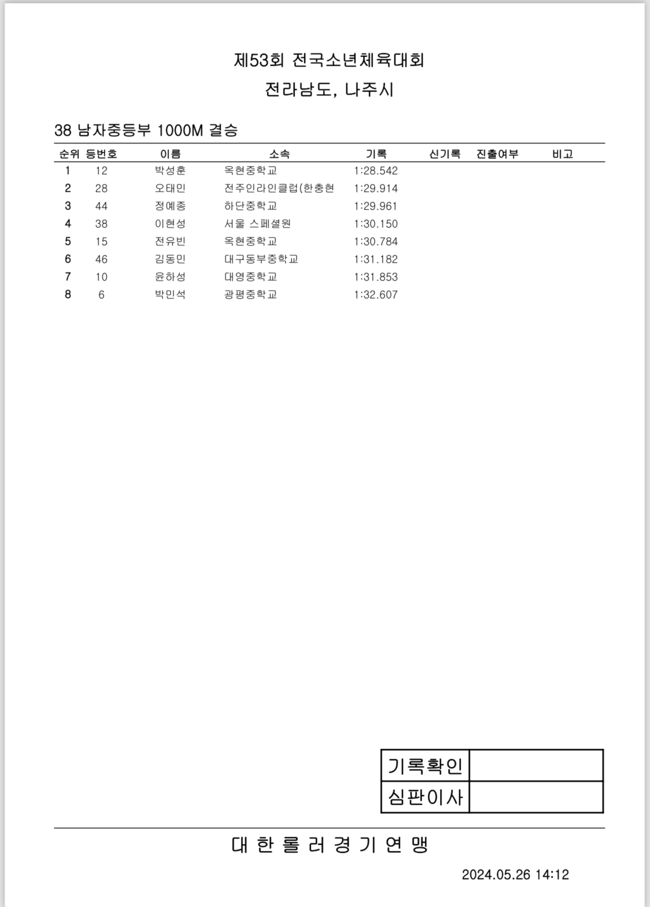 제53회 전국소년체전 2일차 경기 결과 작성자아바타|작성시간24.05.26|조회수290 목록 댓글 0 글자크기 작게가 글자크기 크게가 제53회 전국소년체전 2일차 경기 결과출처: 대한롤러스포츠연맹43_여자초등부_결승_3000M계주.pdf33.36KB40_남자초등부_결승_1000M.pdf37.14KB42_남자중등부_결승_3000M계주.pdf34.44KB39_여자초등부_결승_1000M.pdf35.35KB44_남자초등부_결승_3000M계주.pdf34.27KB38_남자중등부_결승_1000M.pdf34.90KB37_여자중등부_결승_1000M.pdf34.87KB41_여자중등부_결승_3000M계주.pdf33.04KB 첨부파일첨부된 파일이 16개 있습니다. etc 파일 IMG_2907.PNG 다운로드 etc 파일 IMG_2908.PNG 다운로드 etc 파일 IMG_2909.PNG 다운로드 etc 파일 IMG_2910.PNG 다운로드 etc 파일 IMG_2911.PNG 다운로드 etc 파일 IMG_2912.PNG 다운로드 etc 파일 IMG_2913.PNG 다운로드 etc 파일 IMG_2914.PNG 다운로드 pdf 파일 43_여자초등부_결승_3000M계주.pdf 다운로드 pdf 파일 40_남자초등부_결승_1000M.pdf 다운로드 pdf 파일 42_남자중등부_결승_3000M계주.pdf 다운로드 pdf 파일 39_여자초등부_결승_1000M.pdf 다운로드 pdf 파일 44_남자초등부_결승_3000M계주.pdf 다운로드 pdf 파일 38_남자중등부_결승_1000M.pdf 다운로드 pdf 파일 37_여자중등부_결승_1000M.pdf 다운로드 pdf 파일 41_여자중등부_결승_3000M계주.pdf 다운로드 다음검색 현재 게시글 추가 기능 열기 북마크 공유하기 신고 센터로 신고 댓글 댓글 0 댓글쓰기 답글쓰기 댓글 리스트