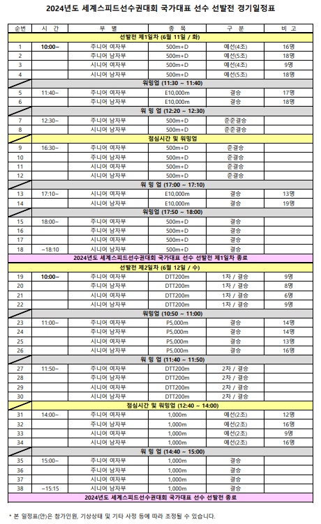 2024 인라인 스피드 국가대표 선발전 프로그램(조편성) 및 경기일정표(수정)를 안내하여 드립니다.