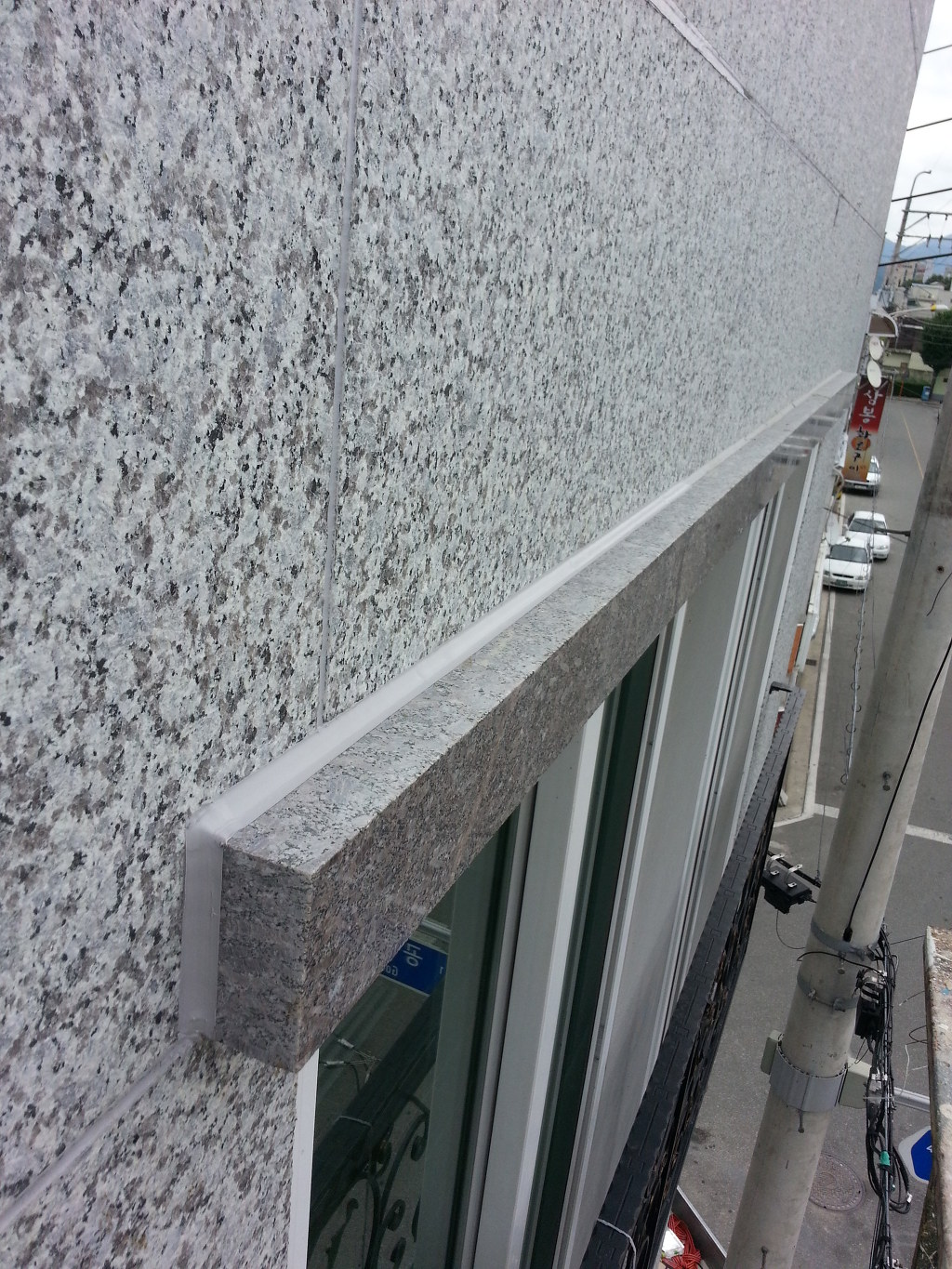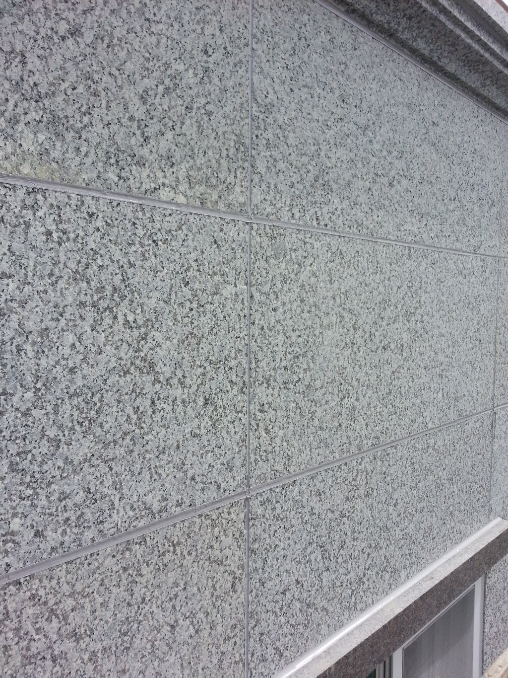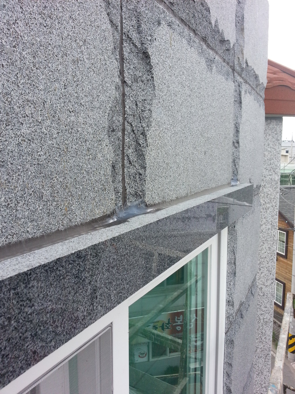 신축한지 두달정도인데 작업차량(스카이)타고 올라가 보니 비오는날 오전에 석재가 비에젖은 상태에서 실리콘 시공을해서 석재 판지쪽에 물과 실리콘 혼합으로 구멍이 많이 보였습니다..구멍난 석재 표면은 칼로 V 커트후 재실리콘처리