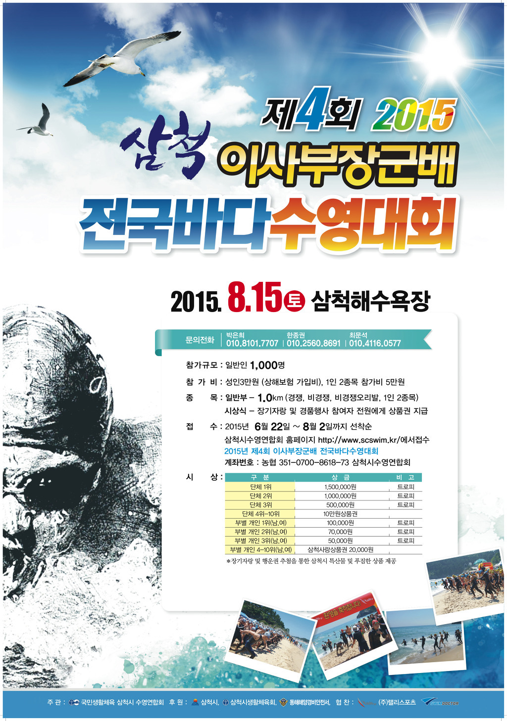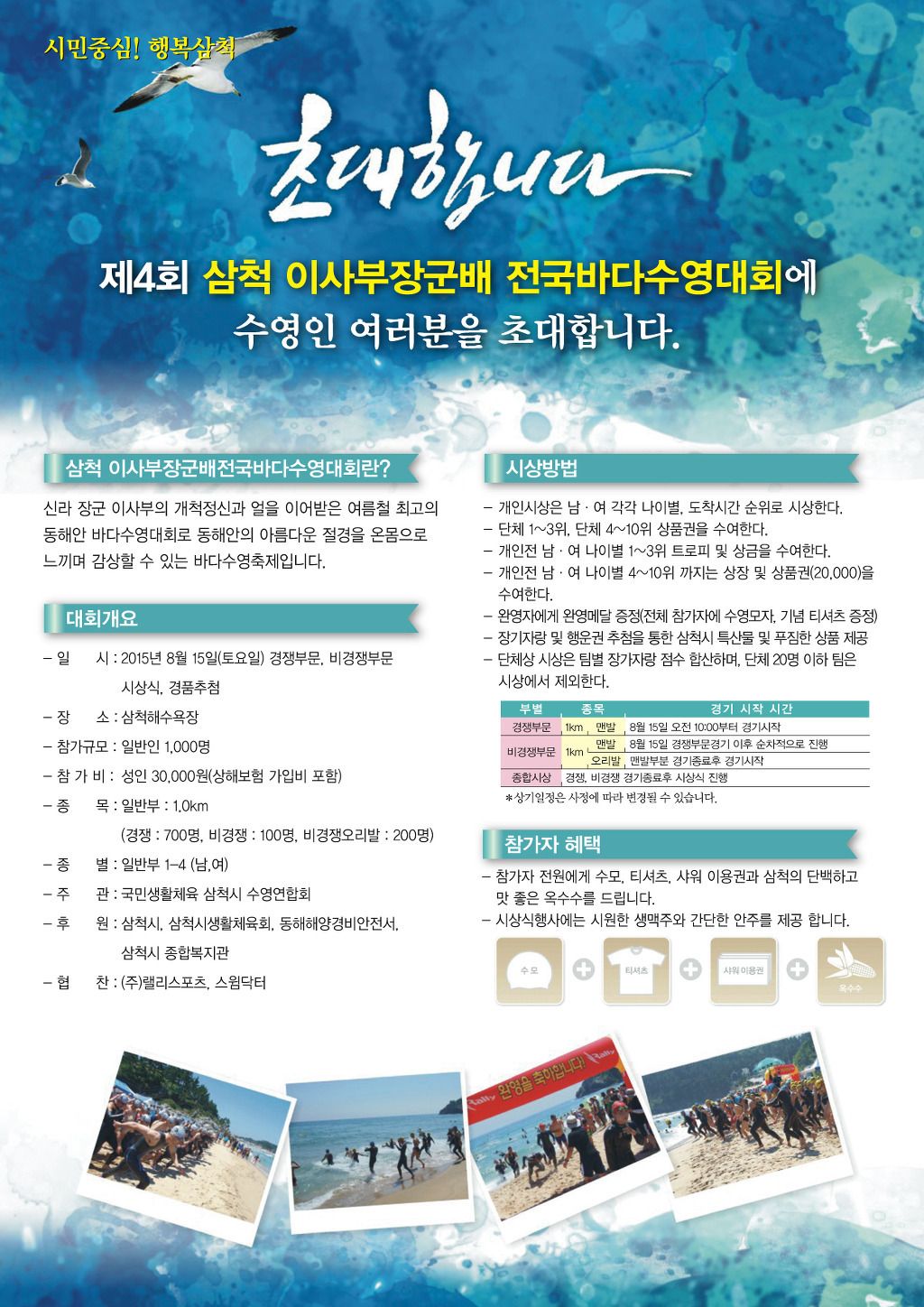 2015년 제4회 이사부장군배 삼척전국바다수영대회에 수영인 여러분을 초대합니다.(대회정보에 올려주세요~) 작성자좋은날|작성시간15.03.24|조회수119 목록 댓글 0 글자크기 작게가 글자크기 크게가 대회신청하러 바로가기 http://www.scswim.kr 다음검색 현재 게시글 추가 기능 열기 북마크 공유하기 신고 센터로 신고 댓글 댓글 0 댓글쓰기 답글쓰기 댓글 리스트