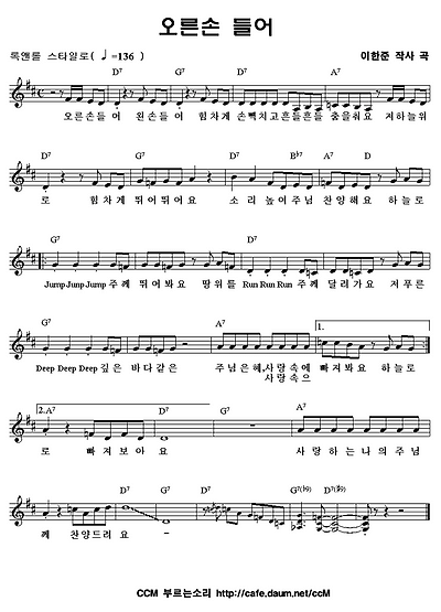 오른손 들어 - 어린이찬양 율동(율동+악보) 작성자카리스마 ~♪|작성시간08.11.21|조회수7,659 목록 댓글 29 글자크기 작게가 글자크기 크게가 오른손 들어 왼손들어 힘차게 손뼉치고 흔들 흔들 춤을 춰요 카페 이름 : CCM 부르는소리카페 주소 : http://cafe.daum.net/ccM 찬양악보는 밑에 첨부해드린 악보를 다운 받으세요 ccM.gif 첨부파일첨부된 파일이 2개 있습니다. gif 파일 ccM.gif gif 파일 ccM.gif 다음검색 현재 게시글 추가 기능 열기 북마크 공유하기 신고 센터로 신고 댓글 댓글 29 댓글쓰기 답글쓰기 댓글 리스트 작성자glory. | 작성시간 10.04.03 너무감사합니다~ 초등1-3학년까지 할예정인대 재미있게 잘할수있을꺼같아요^^ 작성자예꿈이 | 작성시간 10.04.09 감사합니다 신나는 찬양이네요 잘 사용하겠습니다. 작성자Max사랑 | 작성시간 10.11.21 감사감사!!!!넘~신이나서~행복해용!! 작성자마음닿기 | 작성시간 11.06.21 우리 아이들과 감사하는 마음으로 찬양하겠습니다. 작성자오이와께 | 작성시간 11.08.21 감사합니다. 댓글 전체보기