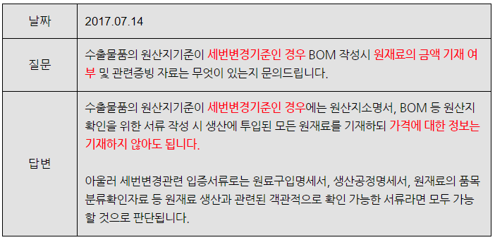 세번변경기준은 원재료와 완제품의 HS CODE정보가 원산지를 판정하는 중요한 요소이지 가격이 원산지판정에 대한 중요한 요소가 아니다. 그렇기 때문에 가격정보는 미소기준 등 특별한 경우가 아니면 세번변경기준에서는 전혀 요구되지 않는다.