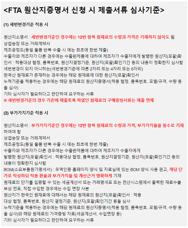 세번변경기준의 경우 원산지소명서에 가격정보에 대한 기재를 하지 않아도 된다는점이 주목할 점이다. 게다가 실제로 해당 가격으로 원재료를 구매했는지에 대한 내용도 심사할 필요가 없기 때문에 원재료의 구매증빙서류 또한 제출 면제되었다.