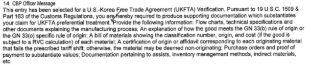 한-미 FTA 검증시 사용되는 CBP FORM 28에서는 다음과 같은 서류가 요청된 바 있다.