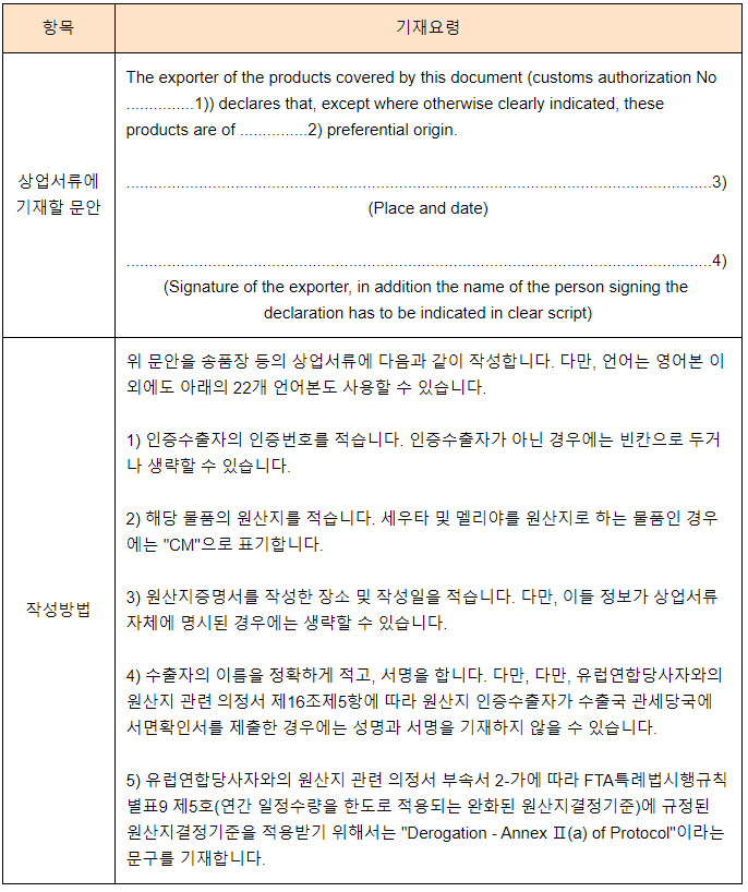 원산지인증수출자에 의한 원산지신고서 작성시 가장 중요한 것은 한-EU FTA에서 정하고 있는 송품장 등의 상업서류에 원산지인증수출자가 원산지신고문안을 작성하여야 한다는 것이다.