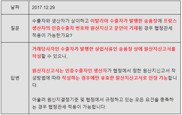 본 사례는 이탈리아의 수출자가 작성한 인보이스에 프랑스의 생산자가 원산지신고문구를 기재한다면 한-EU FTA를 인정해주겠다는 것이다.