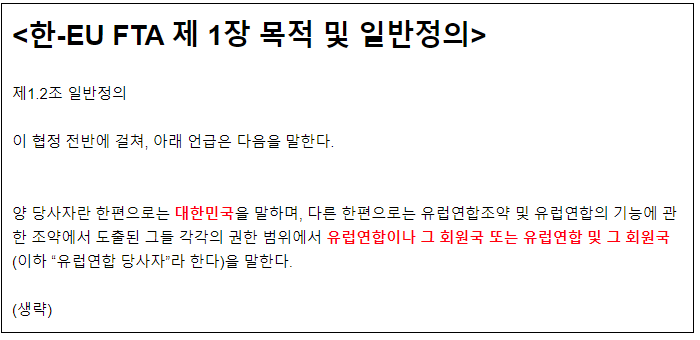 한-EU FTA는 대한민국과 유럽연합(EU) 그리고 그 회원국을 말하고 있다. 즉, 유럽연합 자체도 당사자의 개념에 포함하고 있다는 것이 중요하다.