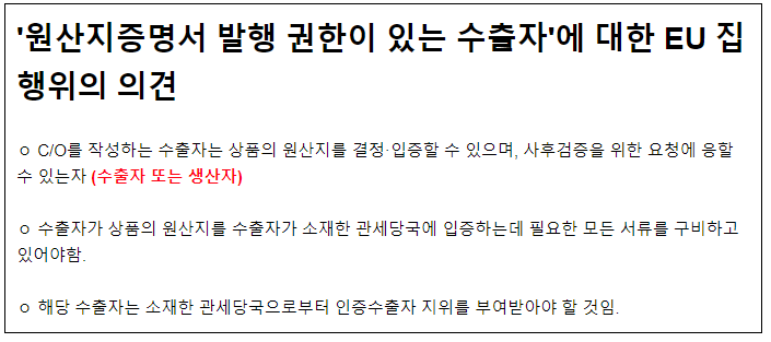 원산지 인증'수출자'라는 명시적인 내용으로 인하여 한-EU FTA 초기 우리나라에서는 생산자의 원산지신고서 기재를 인정하지 않으려는 움직임이 있었으나, 한국관세청이 원산지신고서를 작성할 권한이 있는 수출자의 범위에 대해 EU집행위에 질의하였고 그에 대한 답변은 다음과 같았다.