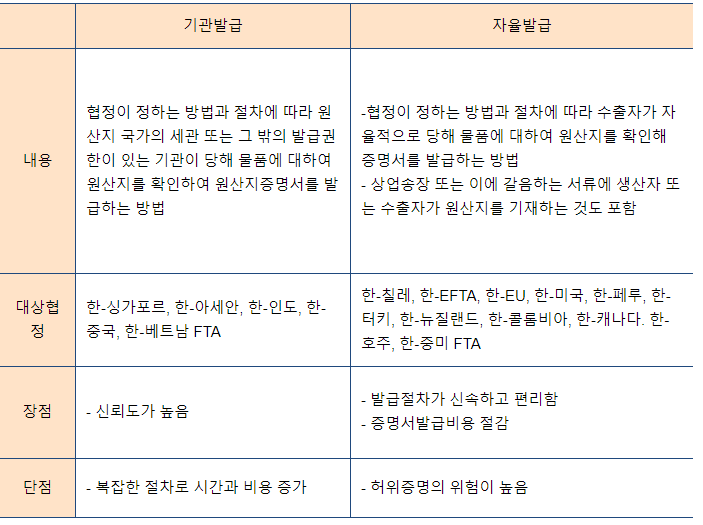 우리나라는 현재까지는 아시아지역의 국가와의 FTA에서는 기관발급 원산지증명서 발급체계를 운영하고 그 이외의 국가와는 자율발급체계를 통한 FTA를 운영하고 있다.