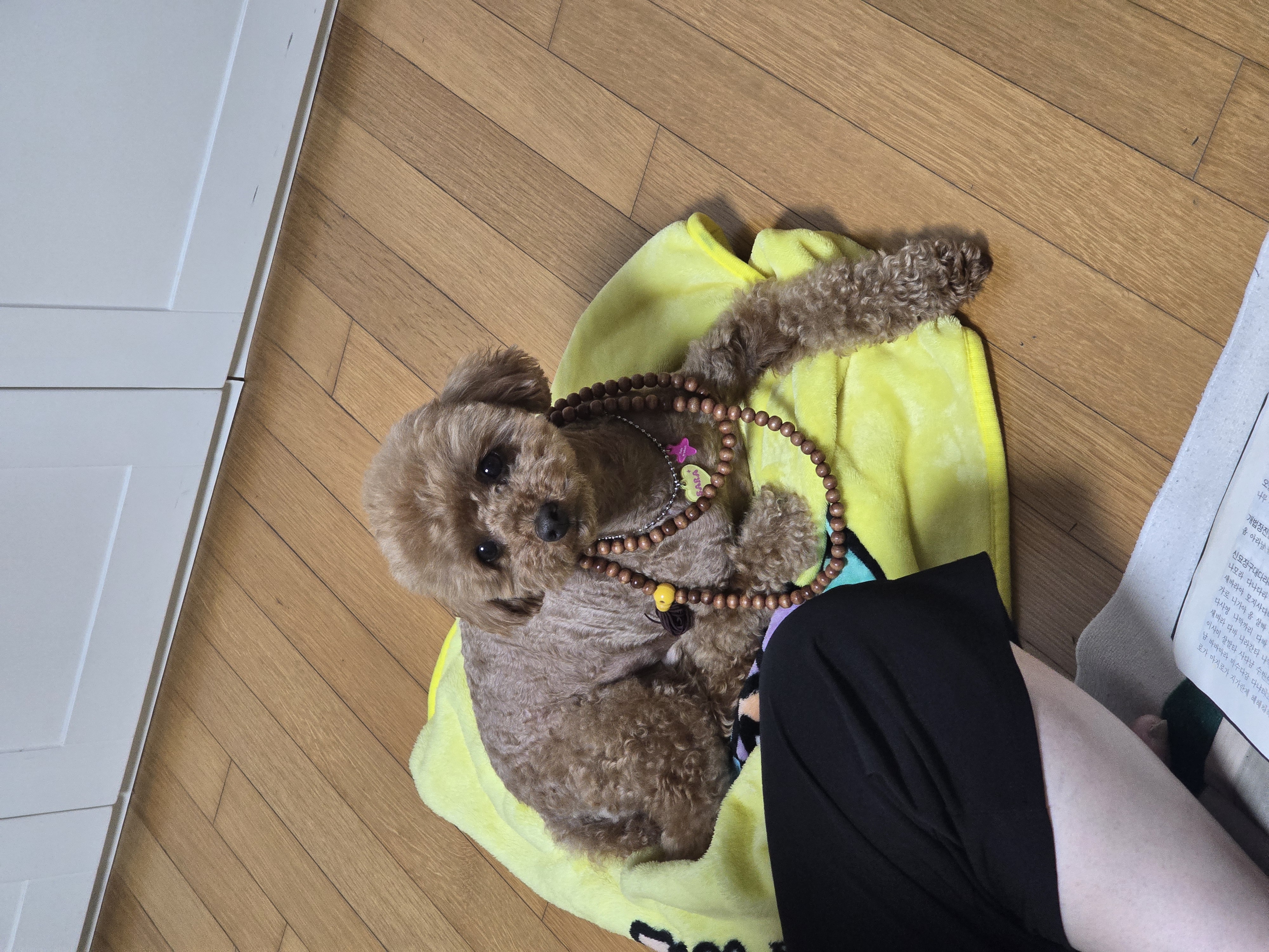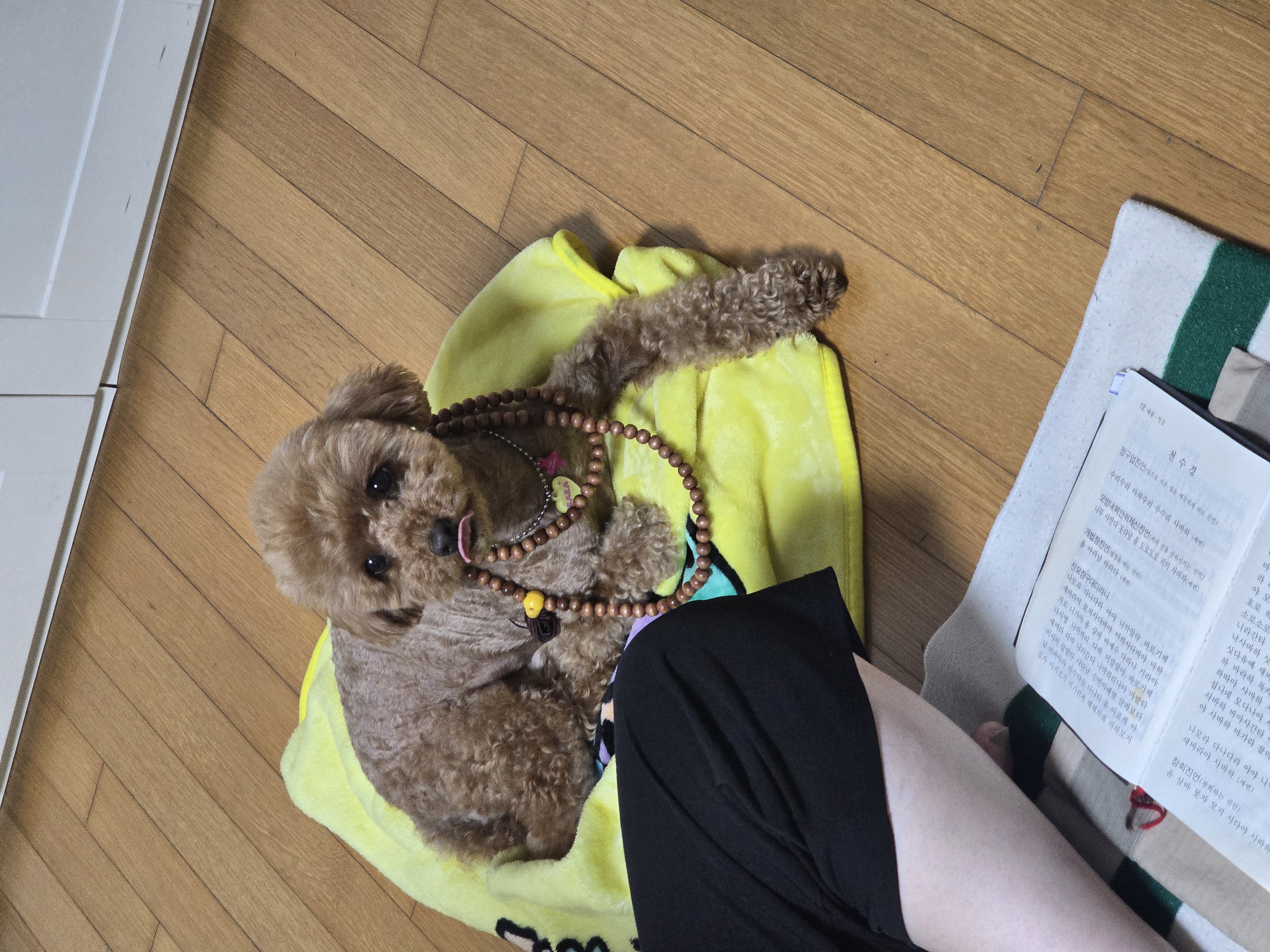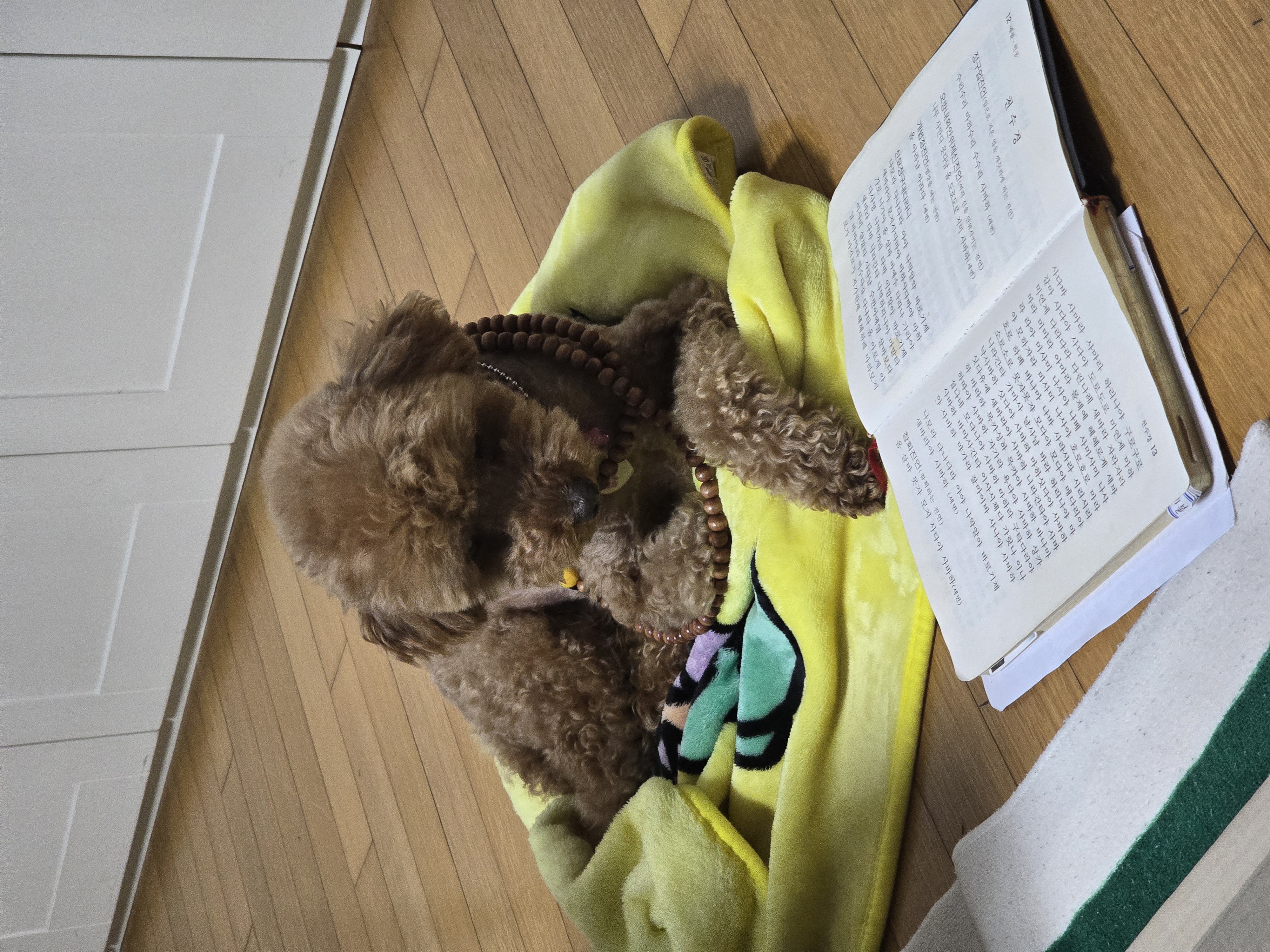 불교집안 강쥐답게 기도하는 엄마 옆에서 염주 두르고 경전을 읽고 있네요😂