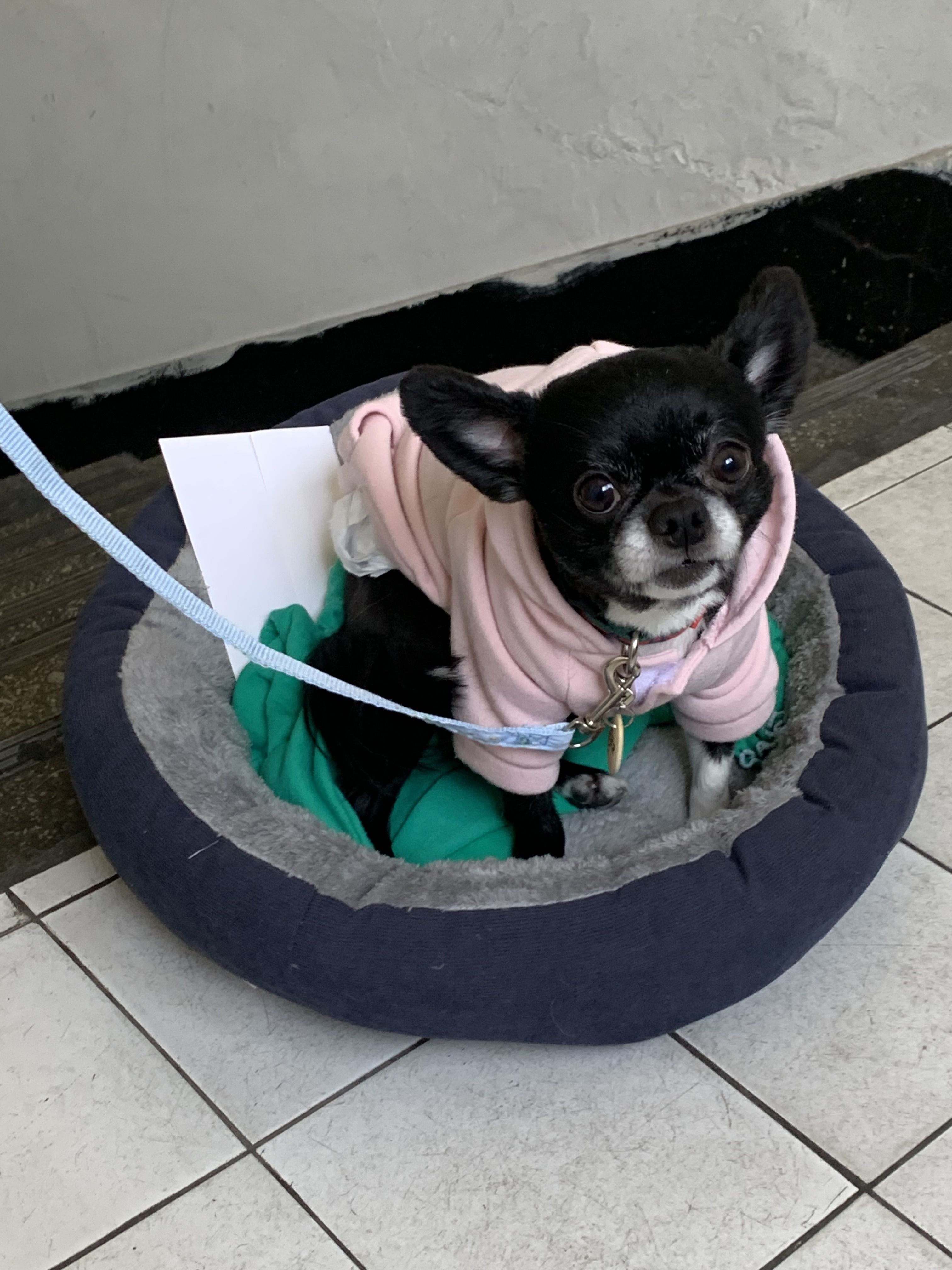보호소 앞 난간에 리드줄이 묶인 채, 방석 위에 덩그러니 놓여있던 치와와 한 마리.