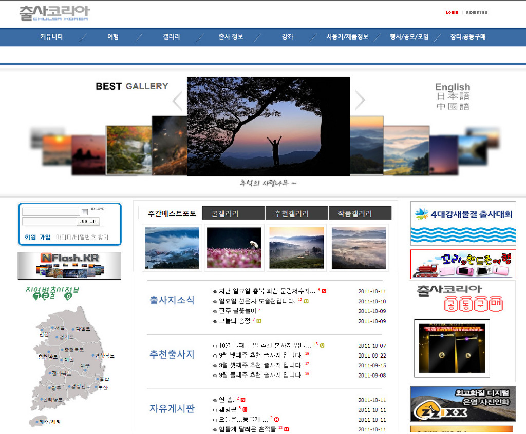출사코리아 작성자가경동심|작성시간11.10.11|조회수563 목록 댓글 2 글자크기 작게가 글자크기 크게가 출사정보와 작품들을 소개해 주는 출사코리아입니다. http://chulsa.kr/ 다음검색 현재 게시글 추가 기능 열기 북마크 공유하기 신고 센터로 신고 댓글 댓글 2 댓글쓰기 답글쓰기 댓글 리스트 작성자권선국 | 작성시간 11.10.12 출사코리아는 주로 풍경을 촬영하는 사이트입니다. 위 목록중 "강좌"에 들어가서 보면 여러가지 사진촬영에 대한 방법들을 자세히 설명하였고, 이와 동등한 사이튼 "낭만포트"인데 이 또한 주로 풍경을 촬영하는 사이트입니다. 답댓글 작성자가경동심 작성자 본인 여부 작성자 | 작성시간 11.10.12 낭만포토클럽이더군요. 추가로 사진관련추천사이트에 올렸습니다. 댓글 전체보기