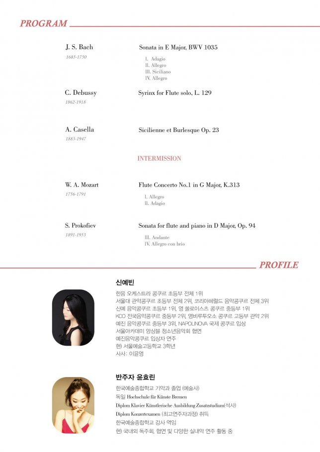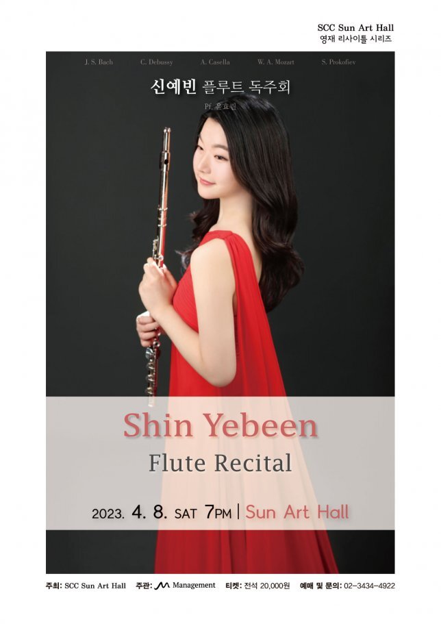 신예빈 플루트 독주회 일시 : 2023년 4월 8일 토요일 7pm 장소 : SCC 선 아트홀 (서초구 동산로 44, 지하 2층) 주최 : SCC 선 아트홀 주관 : 엠매니지먼트 티켓 : 전석 20,000원 예매 및 문의 : 02-3434-4922 |