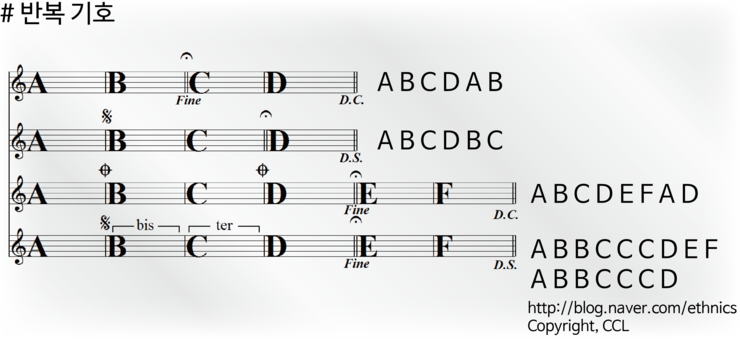 이런 반복기호를 사용하는 이유는 종이, 잉크값을 아끼는 용도도 있고, 연주 중에 연주자가 악보를 넘기는 수고로움을 방지하는 효과도 있습니다.