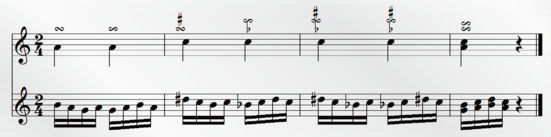 중간의 선이 내려가는 것은 2도 위 - 본음 - 2도 밑 - 본음이고, 중간의 선이 올라가는 것은 2도 아래 - 본음 - 2도 위 - 본음 입니다.