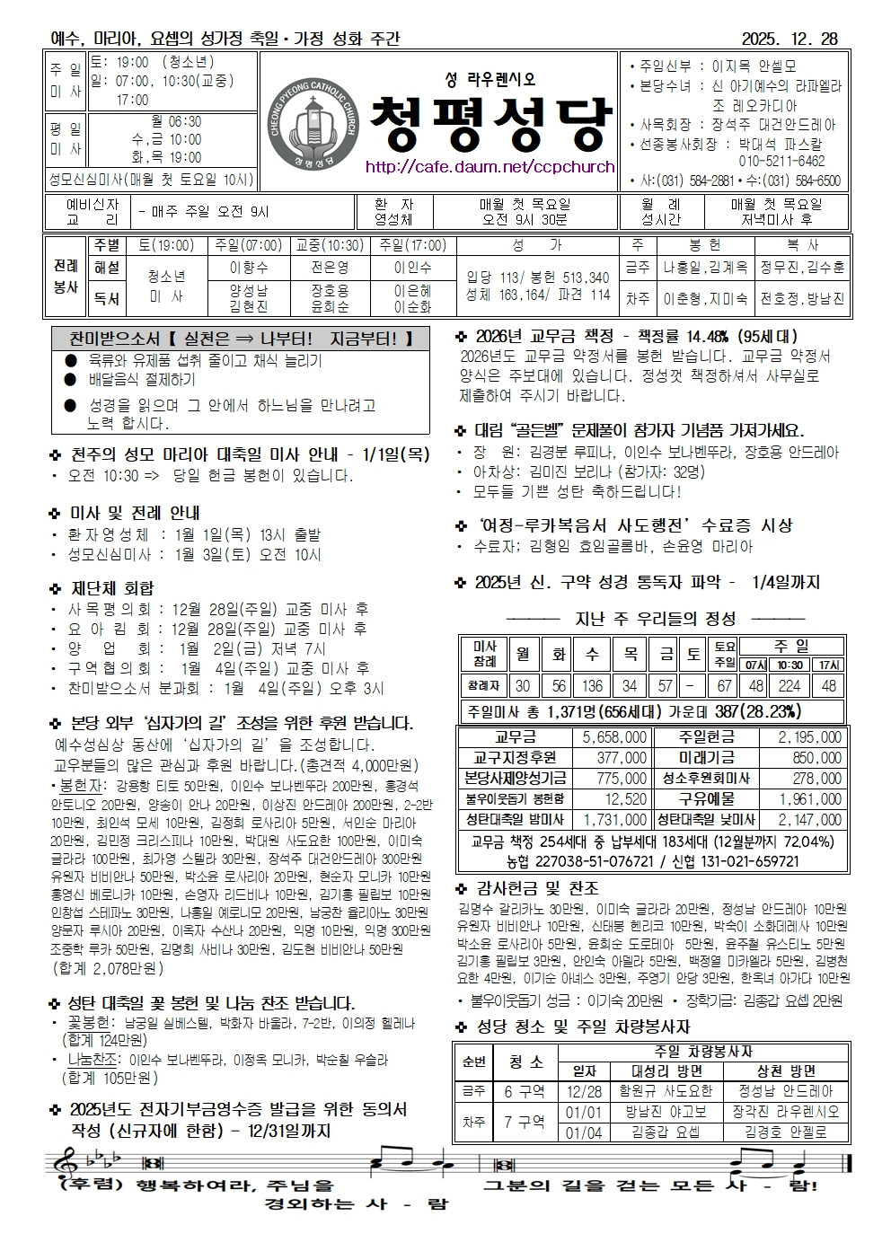 2025년 12월 28일 예수, 마리아, 요셉의 성가정 축일ㆍ가정 성화 주간 작성자미소지움|작성시간25.12.26|조회수143 목록 댓글 0 글자크기 작게가 글자크기 크게가 제2360호.pdf4.38MB 첨부파일첨부된 파일이 2개 있습니다. pdf 파일 제2360호.pdf 다운로드 jpg 파일 2025년 12월 28일001.jpg 다운로드 다음검색 현재 게시글 추가 기능 열기 북마크 공유하기 신고 센터로 신고 댓글 댓글 0 댓글쓰기 답글쓰기 댓글 리스트