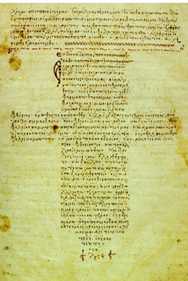 히포크라테스 선서. 12세기 비잔틴의 사본으로, 기독교의 상징인 십자가 모양으로 본문을 배치한 것이 이채롭다. 히포크라테스의 권위는 중세에도 여전했지만, 기독교의 영향으로 선서의 서두에는 의술의 신 ‘아폴론’의 이름 대신에 ‘야훼’와 ‘예수’의 이름이 들어가곤 했다. <출처 : Wikipedia> | |