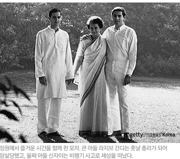 인디라 간디는 당시 두 아이의 엄마였는데 먼 훗날 자신의 두 아들의 운명도 어미의 운명과 다르지 않으리라는 것은 결코 짐작할 수 없었을 것이다. 그녀의 정치적 후계자였던 아들 산자이는 비행기 사고로 죽었다. 총리가 된 또 다른 아들 라지브 간디는 타밀 지역 유세 도중 타밀 타이거란 단체 조직원이 꽃다발 속에 넣어둔 폭탄이 터져 폭사한다. 모든 이의 눈에서 눈물을 지우는 것은 네루 가문의 피도 함께 요구한 것일지도 모르겠다. | |