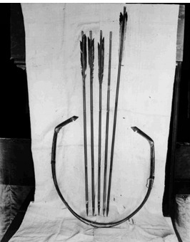 조선 태조가 1398년 권좌에서 물러난 후에 거처한 함흥본궁의 조선 태조 이성계의 각궁과 전(箭)의 사진. 말년에도 활쏘기를 즐겨 할 정도로 태조 이성계는 뛰어난 무장이었다. <출처 : 국사편찬위원회 한국사데이터베이스 (NIKH.DB-fl_006_001_000_0012)> |