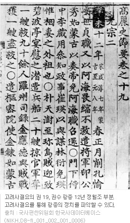 고려사에서 광종(光宗, 925~975, 재위 949~975)은 어떤 왕이었을까. 노비안검법과 과거제도, 관복 제정 등 왕권 강화를 위해 그가 이룬 정책들은 역사적으로 대단히 의미 있고 중요한 업적이었다. 그럼에도 그의 업적에 대한 평가가 엇갈리는 것은 재위 중반부터 시작된 공신과 왕실에 대한 피의 숙청 때문일 것이다. 고려 성종 대 이후 유학자들은 광종을 평가하는데 인색하였다. 당대의 유학자 최승로(崔承老)나 고려 말의 이제현, 그리고 도의(道義)를 중시한 조선시대 유학자들에게 비친 광종은 참소(讒訴)를 좋아한 왕이었고 광기의 왕이었다. | |