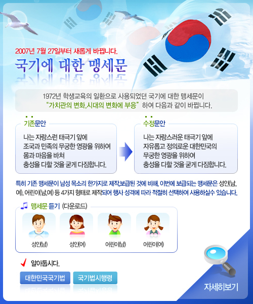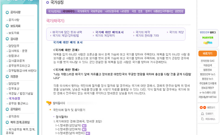 국기에 대한 경례-애국가-묵념곡 다운로드(행정안전부) 작성자미스터빈|작성시간09.01.08|조회수2,728 목록 댓글 0 글자크기 작게가 글자크기 크게가 행정안전부 - 국기에 대한 맹세, 애국가, 묵념곡을 다운 받을 수 있는 곳 --> 아래 주소 http://www.mopas.go.kr/gpms/view/korea/korea_index_vm.jsp?cat=bonbu/chief&menu=chief_06_04_02_sub02#pos1 다음검색 현재 게시글 추가 기능 열기 북마크 공유하기 신고 센터로 신고 댓글 댓글 0 댓글쓰기 답글쓰기 댓글 리스트