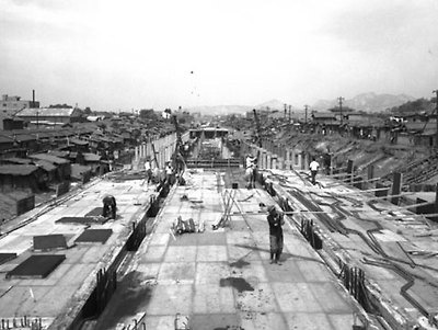 - 청계 고가도로가 건설되기 직전인 1967년 5월 청계천의 복개 공사 모습. 청계 고가도로는 김현옥 서울시장이 뚫은 수많은 도로들 중 하나였다./서울시 제공
