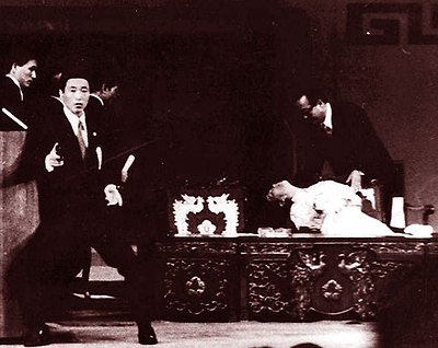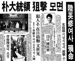 - 1974년 8월 15일 서울 국립극장에서 문세광의 저격 직후 경호원들이 연대 뒤의 박정희 대통령을 호위하고 있는 가운데 피격당한 대통령 부인 육영수 여사가 쓰러져 있다. 조선일보 사진부 임희순 기자의 이 특종 사진은 다음날 신문에 게재되지 못하고 6일 뒤에야 실렸다. /조선일보 DB