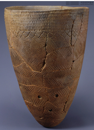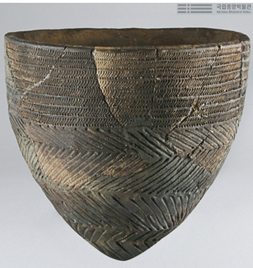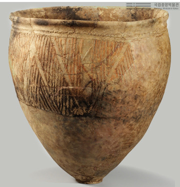 서울 암사동 5호 집터에서 출토된 빗살무늬 토기. 우리나라 신석기시대를 대표하는 완성도 높은 토기이다.