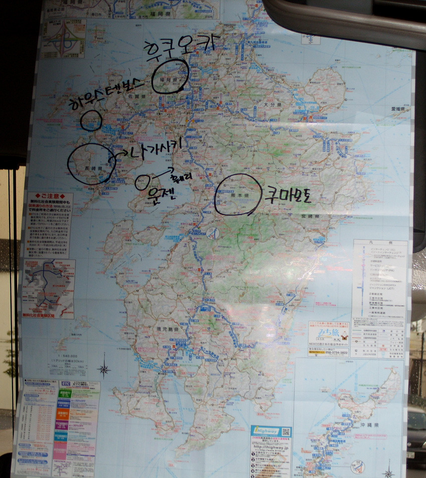 관광버스 안에 가이드가 설명을 위해 붙인 큐슈 여행일정 지도