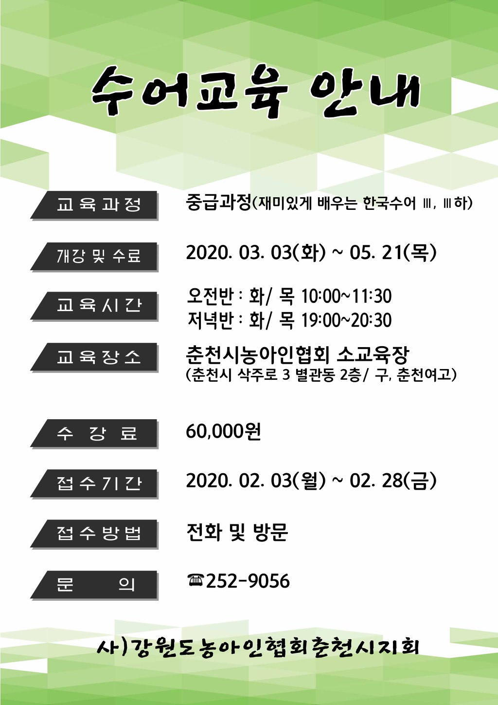 2020년 수어교육(중급과정) 안내 작성자춘천농아인협회|작성시간20.02.06|조회수121 목록 댓글 0 글자크기 작게가 글자크기 크게가 2020년 수어통역사 양성프로그램 수어교육 중급과정(1차) 안내 다음검색 현재 게시글 추가 기능 열기 북마크 공유하기 신고 센터로 신고 댓글 댓글 0 댓글쓰기 답글쓰기 댓글 리스트