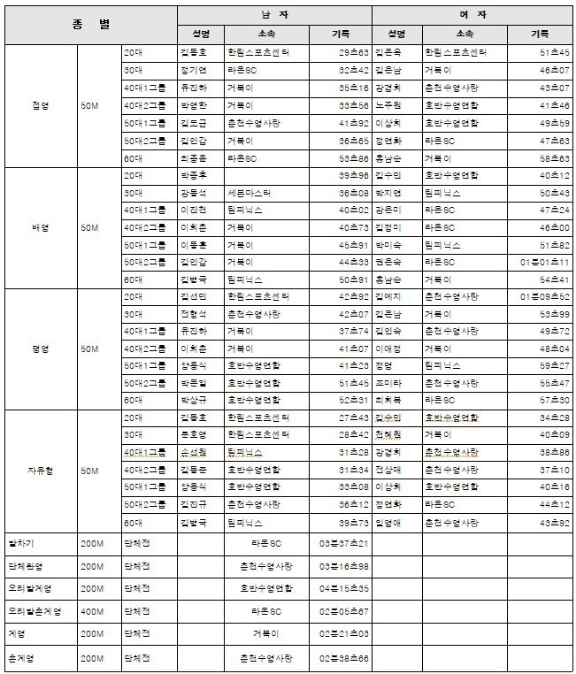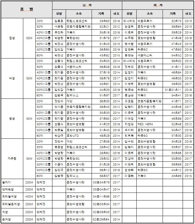 춘천시민생활체육대축전 신기록 현황및 2018대회 1위기록 작성자생활체육전무이사(김상수)|작성시간19.08.27|조회수332 목록 댓글 0 글자크기 작게가 글자크기 크게가 01기록_춘천시민생활대축전 수영대회 신기록현황(2018기준).hwp 02기록_2018춘천시민생활대축전 수영대회 1위기록.hwp2018년도 기록대회신기록 첨부파일첨부된 파일이 4개 있습니다. jpg 파일 2018년도시민대회기록.jpg 다운로드 jpg 파일 시민대화 신기록현황.jpg 다운로드 hwp 파일 01기록_춘천시민생활대축전 수영대회 신기록현황(2018기준).hwp 다운로드 hwp 파일 02기록_2018춘천시민생활대축전 수영대회 1위기록.hwp 다운로드 다음검색 현재 게시글 추가 기능 열기 북마크 신고 센터로 신고 댓글 댓글 0 댓글쓰기 답글쓰기 댓글 리스트
