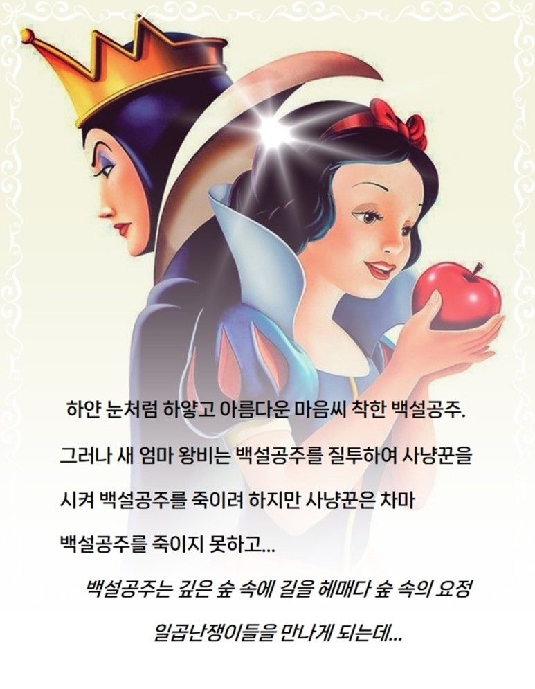 이렇게 물을 때 마다 그 거울은 "그야 물론, 왕비님이십니다"라고 대답하곤 했어요. 백설공주가 7살이 되던 해의 어느 날, 왕비는 여느 때처럼 자신의 아름다움을 확인 받으려 거울에게 질문을 하지만, 거울은