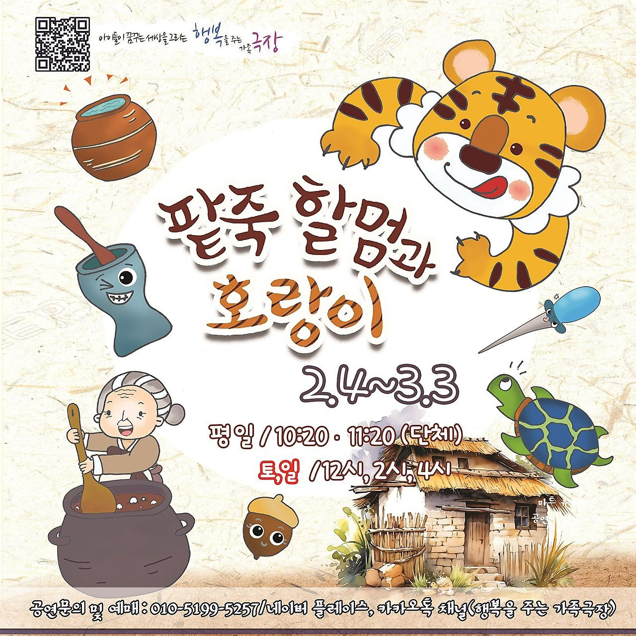 2월은 너무나 잘 알려져 있고 재미있는 전래동화 " #팥죽할멈과호랑이 "를 신나는 뮤지컬로 공연합니다. 아이들이 좋아하고 전래동화 뮤지컬 #팥죽할멈과호랑이 공연 보러 오세요~~