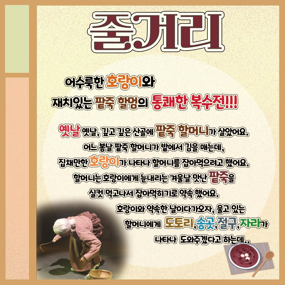 신년 두번째 공연은 너무나 재밌고 잘 알려진 전래동화 [팥죽할멈과 호랑이] 입니다.
