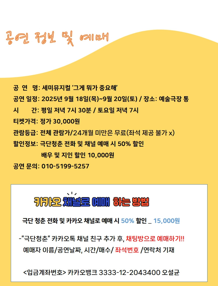 세미뮤지컬 <그게 뭐가 중요해> 2025.9.18~9.20 예술극장 통 작성자희땡이 ♪|작성시간25.08.31|조회수10 목록 댓글 0 글자크기 작게가 글자크기 크게가 다음검색 현재 게시글 추가 기능 열기 북마크 공유하기 신고 센터로 신고 댓글 댓글 0 댓글쓰기 답글쓰기 댓글 리스트