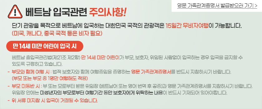 * 부모가 아닌 제 3자가 소아를 베트남으로 데려갈 경우 : 부모동의서, 가족관계 증명서를 준비하셔야 합니다. 모든 서류는 번역 및 공증 후 지참하셔서 입국하셔야합니다.