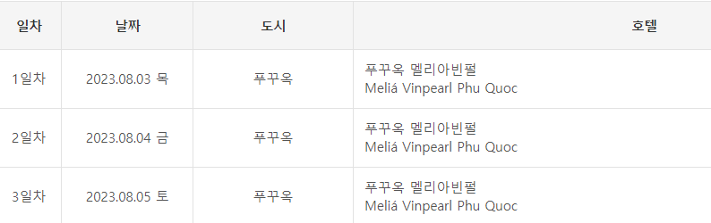 | 인천 08월 03일 (목) 02:40 VJ979 출발 - 푸궉 08월 03일 (목) 06:05 도착 05시간 50분 소요 푸궉 08월 06일 (일) 17:05 VJ978 출발 - 인천 08월 07일 (월) 00:30 도착 05시간 15분 소요 |