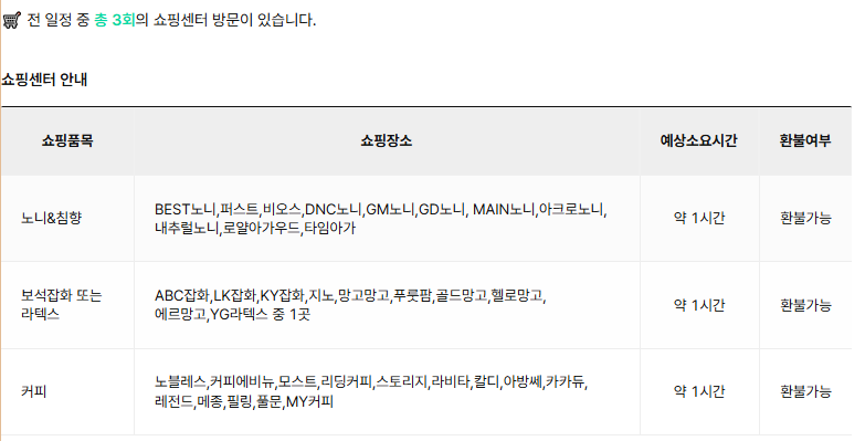 [쇼핑,옵션]전 일정 중 총3회의 쇼핑센터 방문이 있습니다.